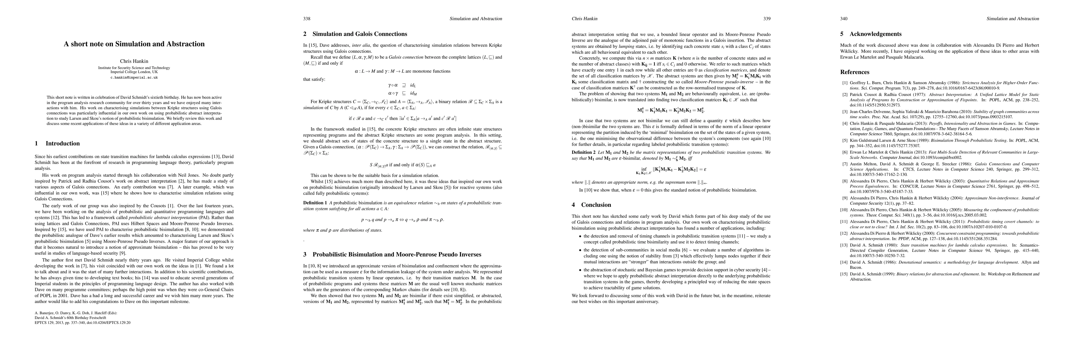 This note celebrates David Schmidt's sixtieth birthday and highlights his influential work on simulations between Kripke structures, which inspired research on probabilistic abstract interpretation and probabilistic bisimulation. It also discusses recent applications of these concepts in diverse fields.