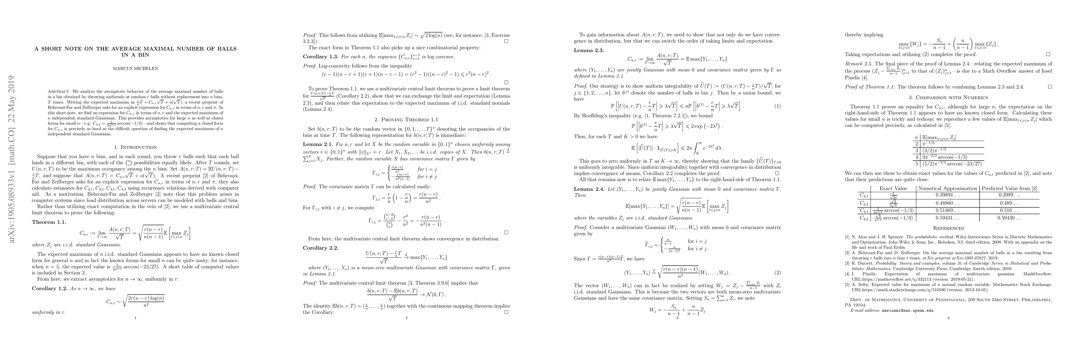 We analyze the asymptotic behavior of the average maximal number of balls in a bin obtained by throwing uniformly at random $r$ balls without replacement into $n$ bins, $T$ times. Writing the expected maximum as $\frac{r}{n}T+ C_{n,r}\sqrt{T} + o(\sqrt{T})$, a recent preprint of Behrouzi-Far and Zeilberger asks for an explicit expression for $C_{n,r}$ in terms of $n,r$ and $\pi$. In this short note, we find an expression for $C_{n,r}$ in terms of $n, r$ and the expected maximum of $n$ independent standard Gaussians. This provides asymptotics for large $n$ as well as closed forms for small $n$---e.g. $C_{4,2} = \frac{3}{2 \pi^{3/2}} \arccos(-1/3)$---and shows that computing a closed form for $C_{n,r}$ is precisely as hard as the difficult question of finding the expected maximum of $n$ independent standard Gaussians.