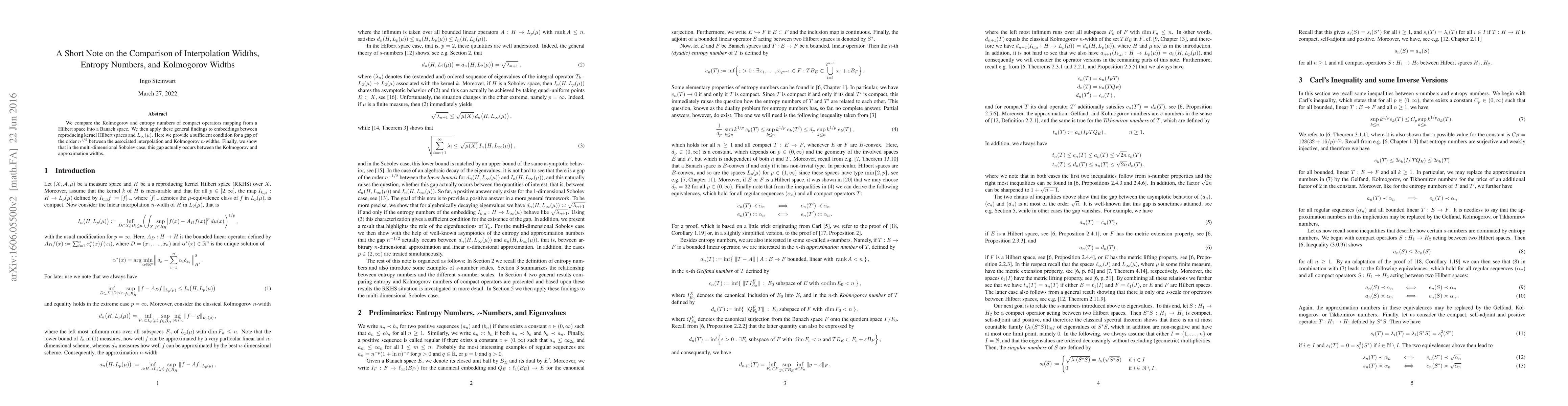 This paper compares the Kolmogorov and entropy numbers of compact operators between Hilbert and Banach spaces, applying these findings to embeddings between reproducing kernel Hilbert spaces and $L_\infty(\mu)$. It establishes a sufficient condition for a $n^{1/2}$ gap between interpolation and Kolmogorov $n$-widths, and demonstrates this gap in multi-dimensional Sobolev cases between Kolmogorov and approximation widths.