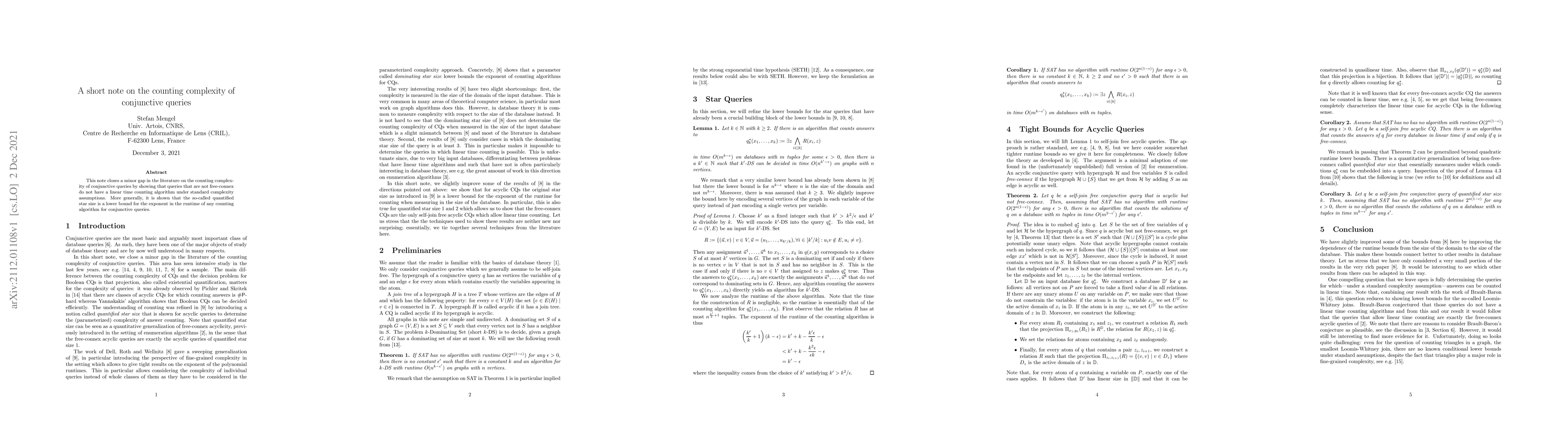 This paper addresses the counting complexity of conjunctive queries, demonstrating that non-free-connex queries cannot be solved in linear time under standard complexity assumptions. It establishes that the quantified star size is a fundamental lower bound for the runtime exponent of any counting algorithm for these queries.
