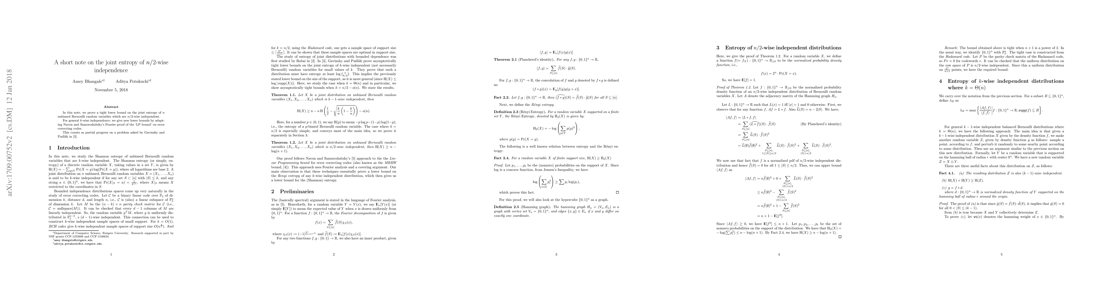 This paper establishes a tight lower bound on the joint entropy of $n$ unbiased Bernoulli random variables that are $n/2$-wise independent. It also extends this result to general $k$-wise independence using a Fourier analytic approach, contributing to the ongoing investigation of entropy bounds in error-correcting codes.