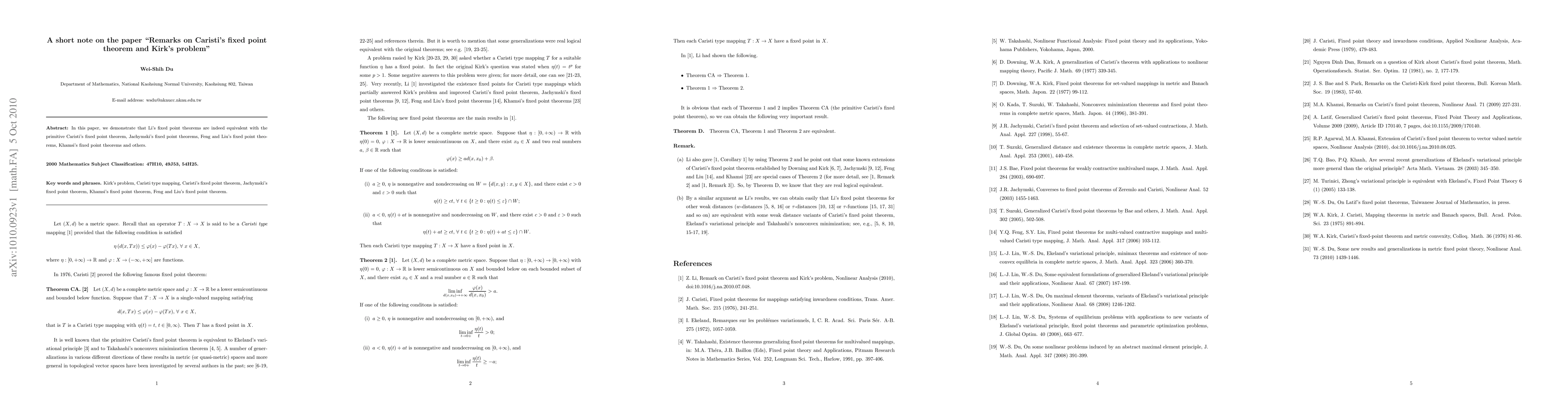 Summary: This paper establishes the equivalence between Li's fixed point theorems and several other prominent fixed point theorems, including Caristi's, Jachymski's, Feng and Liu's, and Khamsi's, thereby unifying various results in the field.