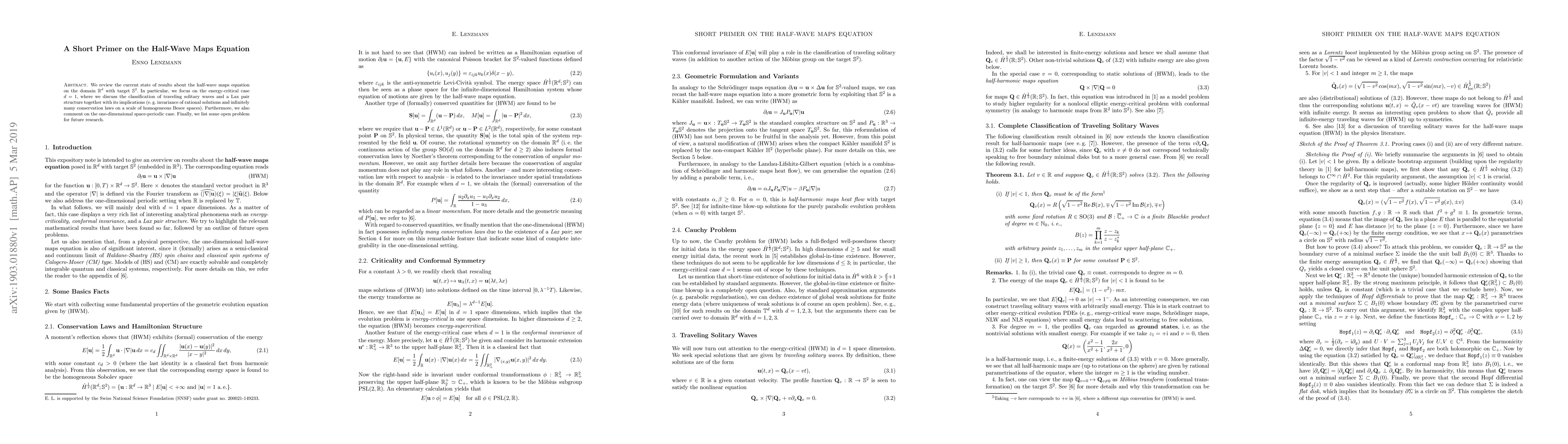 This paper reviews recent findings on the half-wave maps equation in the energy-critical dimension $d=1$, focusing on the classification of traveling solitary waves and the Lax pair structure, which implies invariance of rational solutions and infinitely many conservation laws. It also briefly discusses the space-periodic case and outlines open problems for future research.