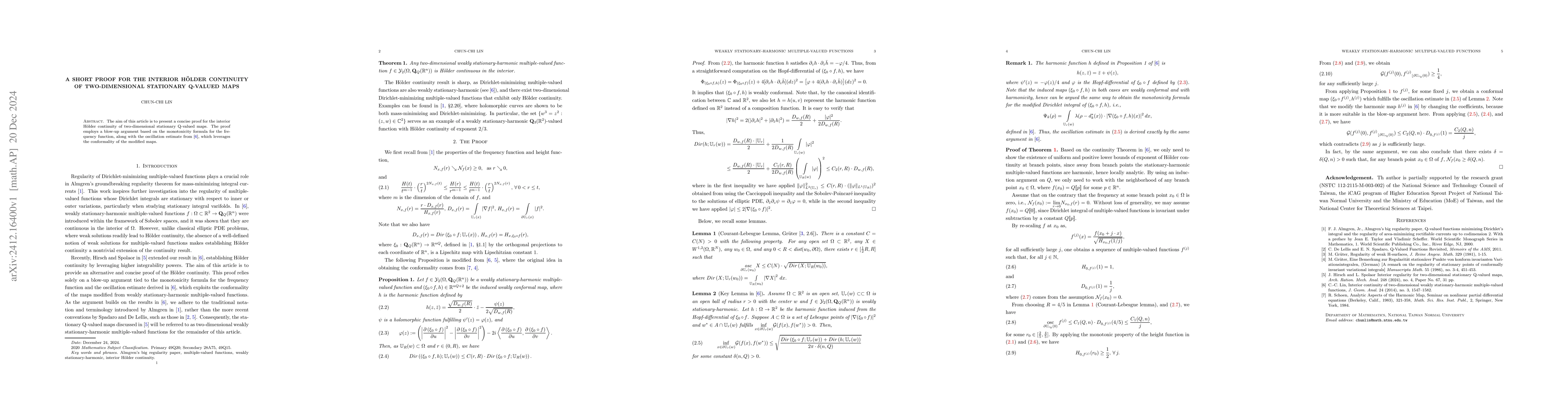 This paper provides a succinct proof for the interior Hölder continuity of two-dimensional stationary Q-valued maps, utilizing a blow-up argument and the monotonicity formula, supplemented by an oscillation estimate from the author's prior work leveraging conformality.