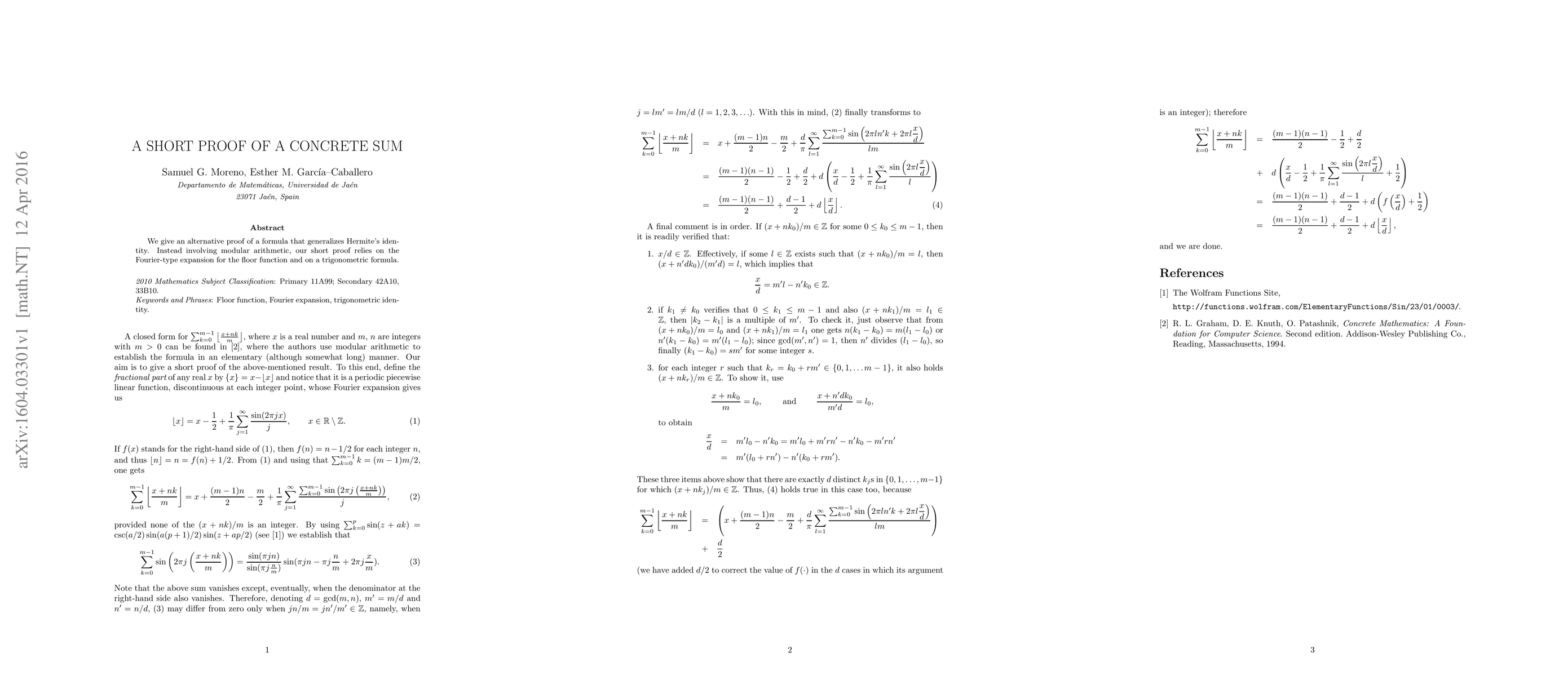 The research uses Fourier-type expansion for the floor function and trigonometric formula to prove a concrete sum.