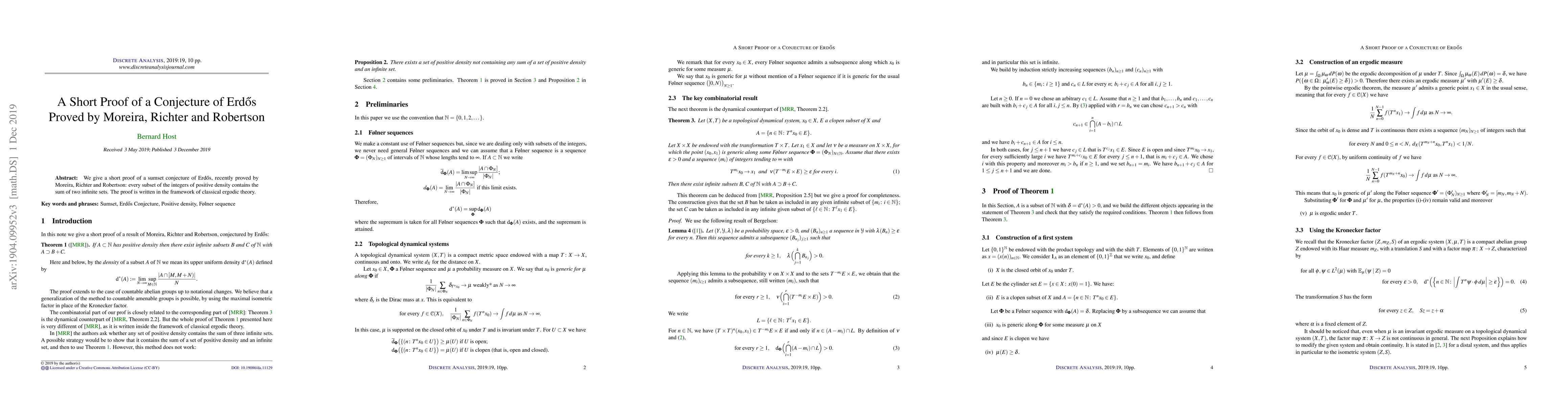 Researchers provide a concise proof of a conjecture by Erd"os, showing that every subset of integers with positive density contains the sum of two infinite sets, using principles from classical ergodic theory.