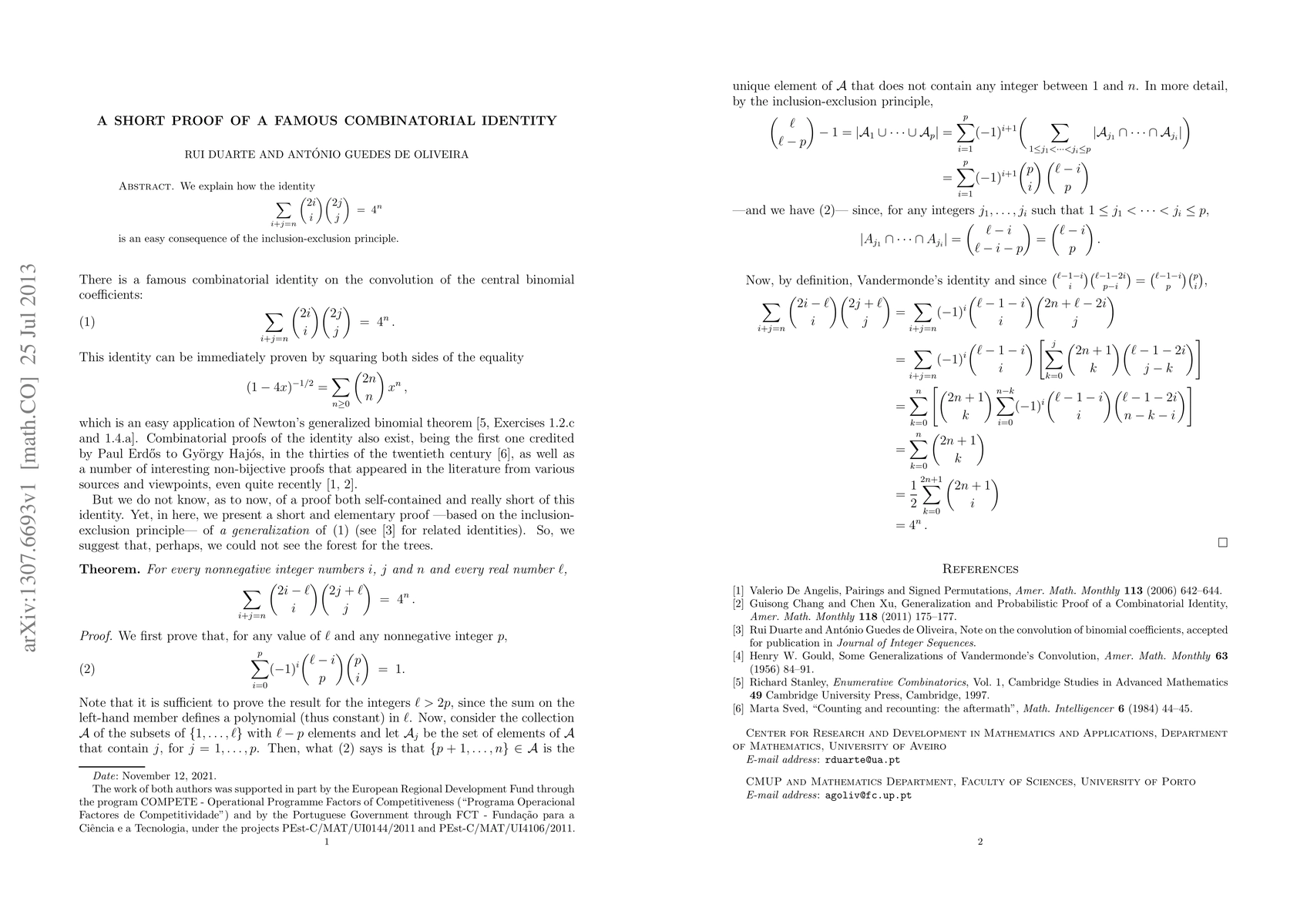 We explain how the identity $$\sum_{i+j=n}\binom{2i}{i}\binom{2j}{j}\;=\;\displaystyle4^n$$ is an easy consequence of the inclusion-exclusion principle.