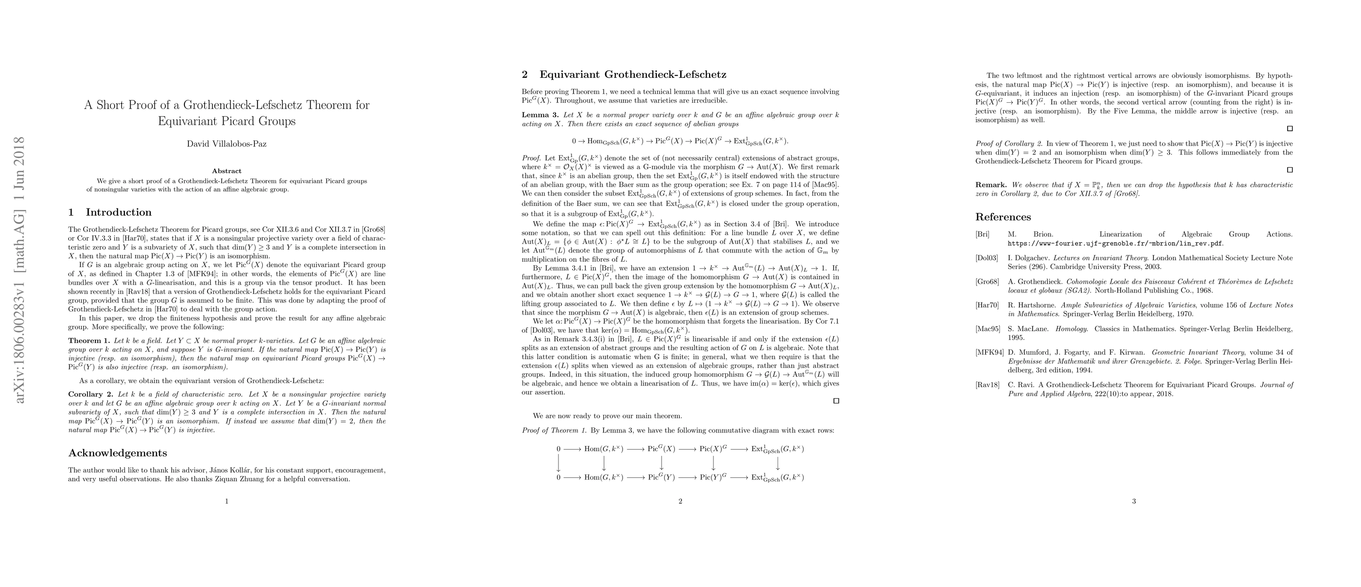 This paper presents a concise proof of the Grothendieck-Lefschetz Theorem for the equivariant Picard groups of nonsingular varieties under the action of an affine algebraic group. The proof aims to simplify existing complex arguments.