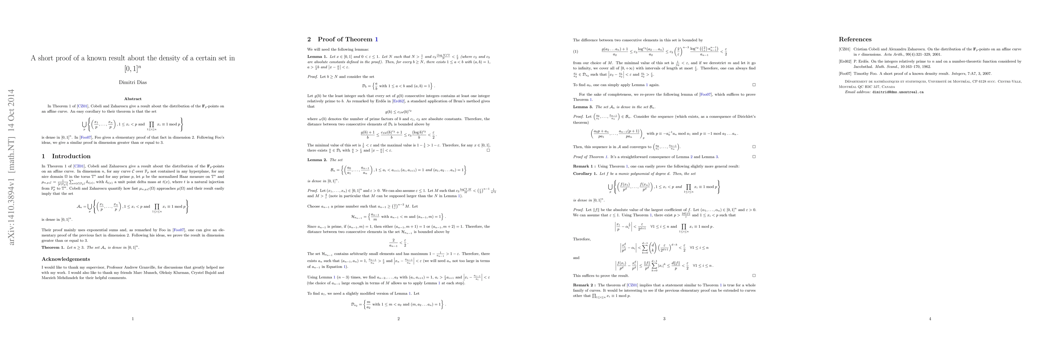 In Theorem 1 of Acta Arith. 99 (2001), 321-329, Cobeli and Zaharescu give a result about the distribution of the ${\bf F}_p$-points on an affine curve. An easy corollary to their theorem is that the set $\bigcup_p \lbrace (\frac{x_1}{p}, ...,\frac{x_n}{p}), 1 \leq x_i < p \text{and} \prod_{1 \leq i \leq n} x_i \equiv 1 \bmod{p} \rbrace$ is dense in $[ 0,1 ]^n$. In Integers 7 (2007), A7, Foo gives a elementary proof of that fact in dimension $2$. Following Foo's ideas, we give a similar proof in dimension greater than or equal to $3$.