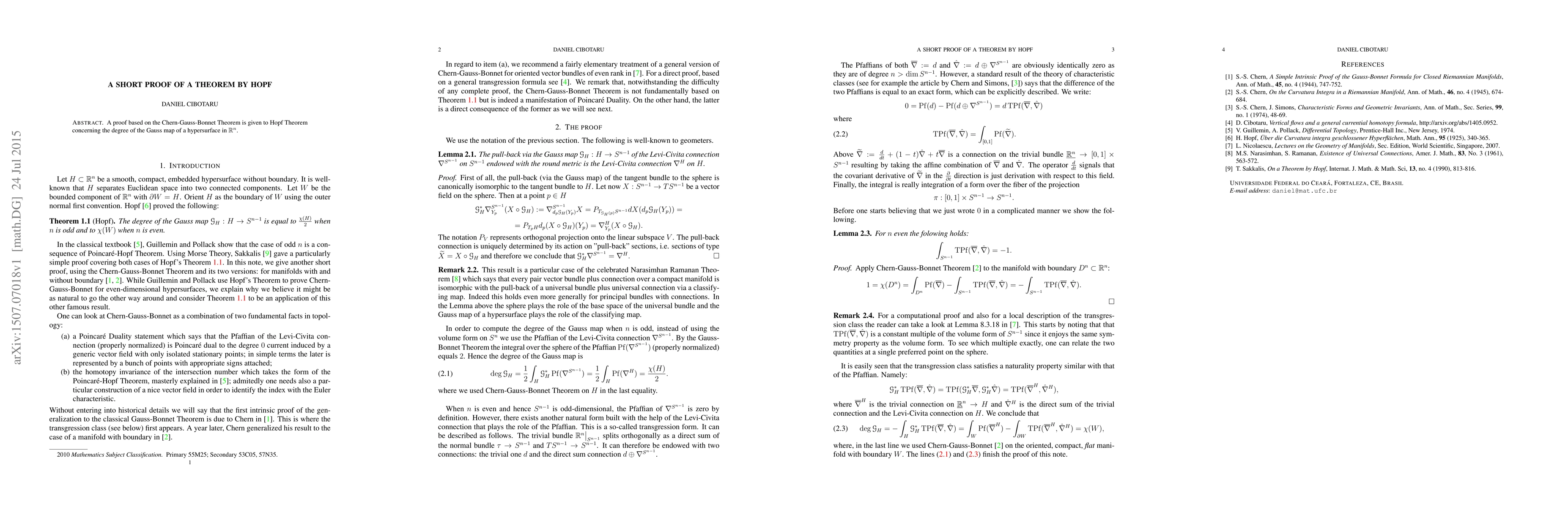 The research used a proof based on the Chern-Gauss-Bonnet Theorem to prove Hopf's Theorem concerning the degree of the Gauss map of a hypersurface in Rn.