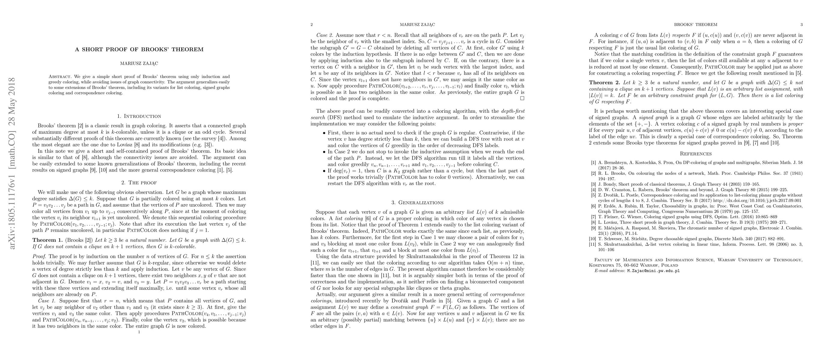 Summary: This paper presents a concise proof of Brooks' theorem employing induction and greedy coloring techniques, avoiding complexities related to graph connectivity, and extending the argument to various coloring variants.
