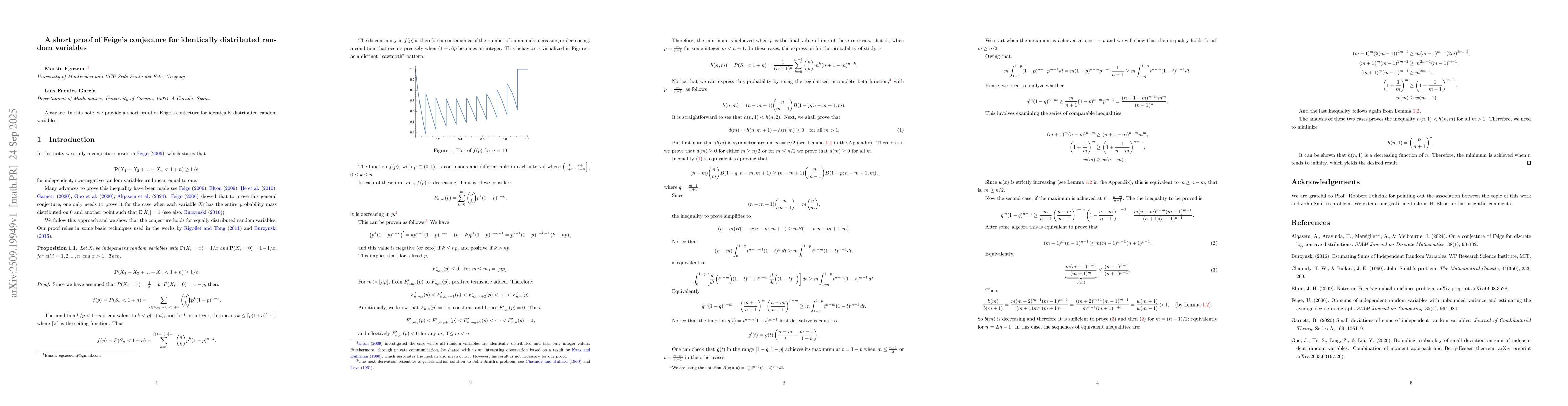 The paper provides a short proof of Feige's conjecture for identically distributed random variables by analyzing the behavior of the function f(p) and its derivatives, leveraging properties of binomial distributions and inequalities involving the incomplete beta function.