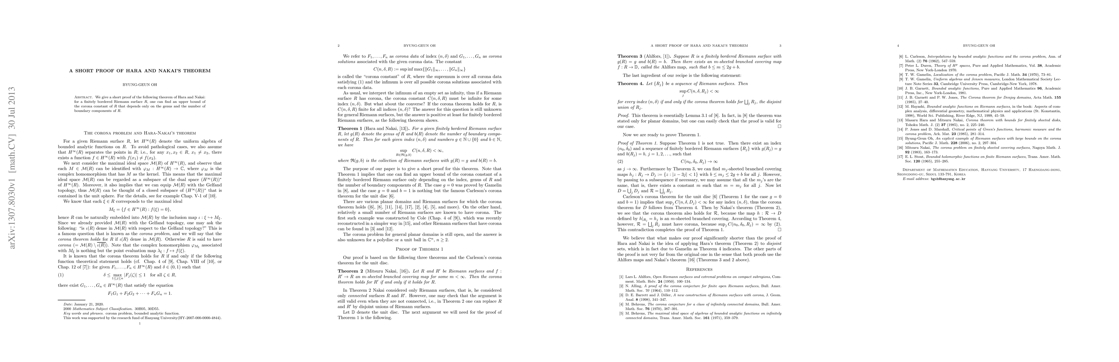 Summary: This paper presents a concise proof for Hara and Nakai's theorem, establishing an upper bound for the corona constant of a finitely bordered Riemann surface based solely on its genus and boundary components.