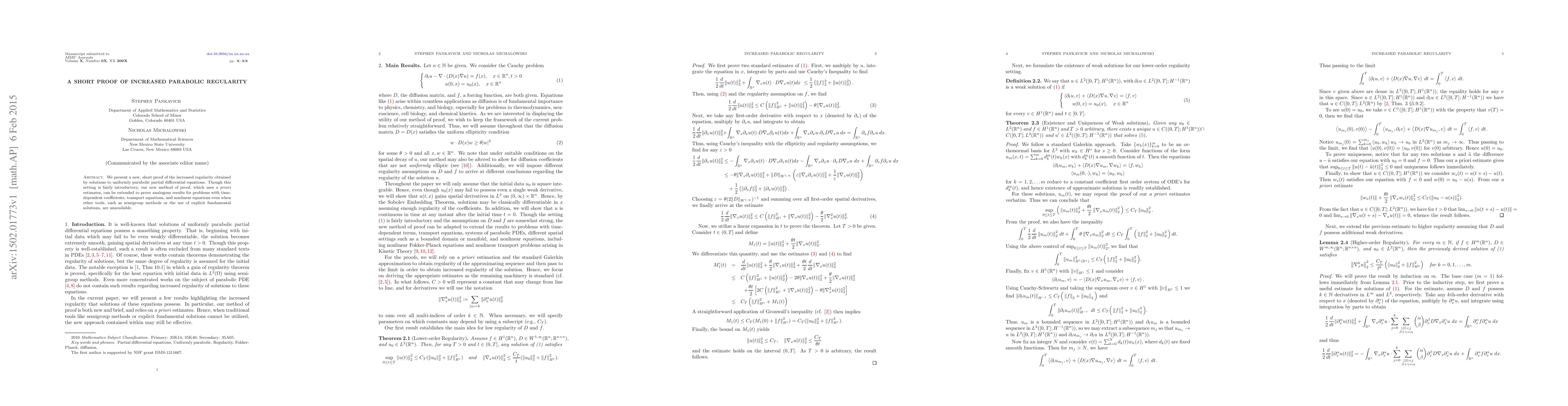 We present a new, short proof of the increased regularity obtained by solutions to uniformly parabolic partial differential equations. Though this setting is fairly introductory, our new method of proof, which uses a priori estimates, can be extended to prove analogous results for problems with time-dependent coefficients, transport equations, and nonlinear equations even when other tools, such as semigroup methods or the use of explicit fundamental solutions, are unavailable.