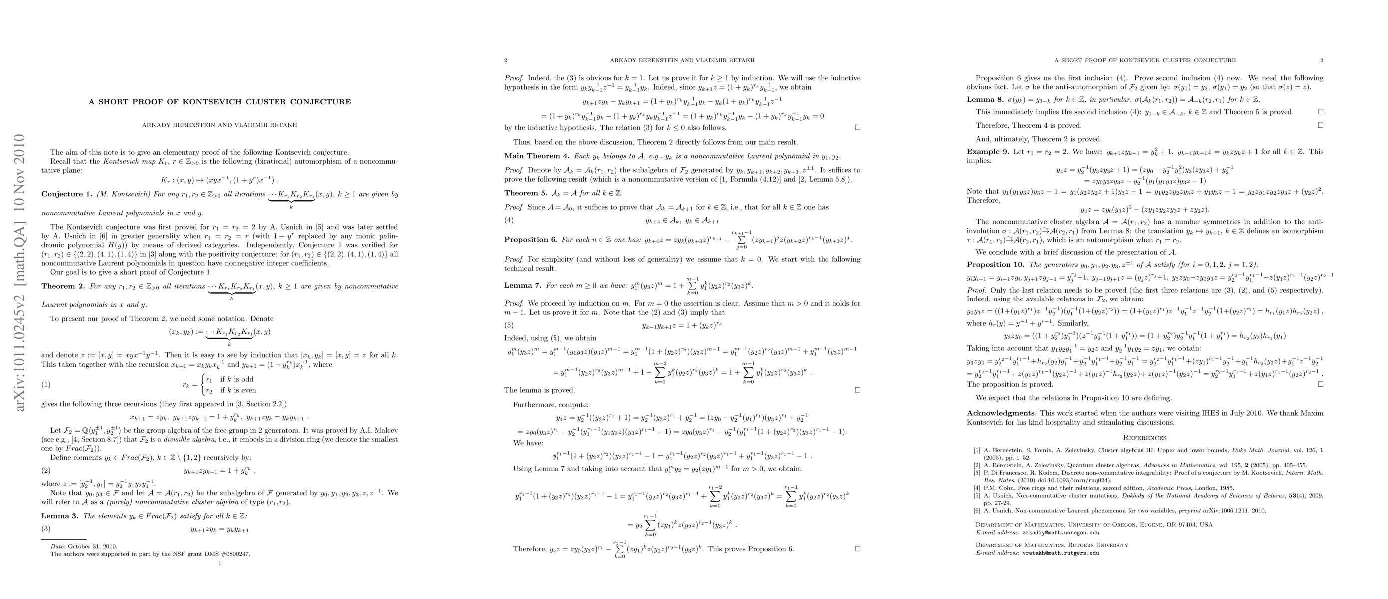 We give an elementary proof of the Kontsevich conjecture that asserts that the iterations of the noncommutative rational map K_r:(x,y)-->(xyx^{-1},(1+y^r)x^{-1}) are given by noncommutative Laurent polynomials.