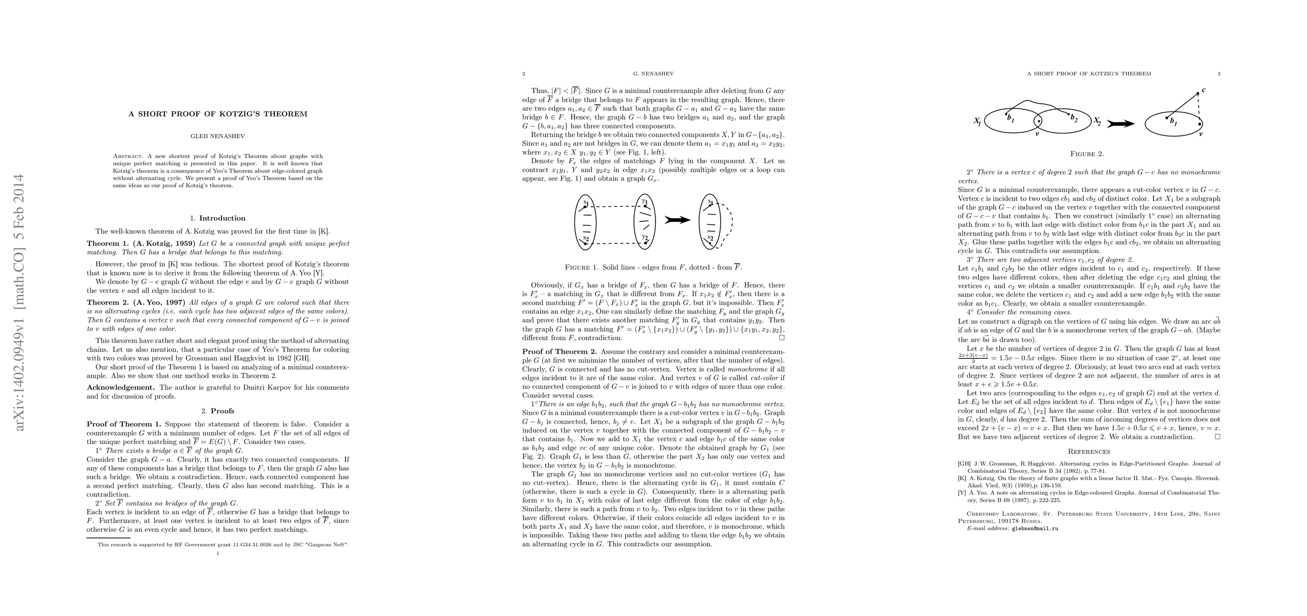 A new shortest proof of Kotzig's Theorem about graphs with unique perfect matching is presented in this paper. It is well known that Kotzig's theorem is a consequence of Yeo's Theorem about edge-colored graph without alternating cycle. We present a proof of Yeo's Theorem based on the same ideas as our proof of Kotzig's theorem.