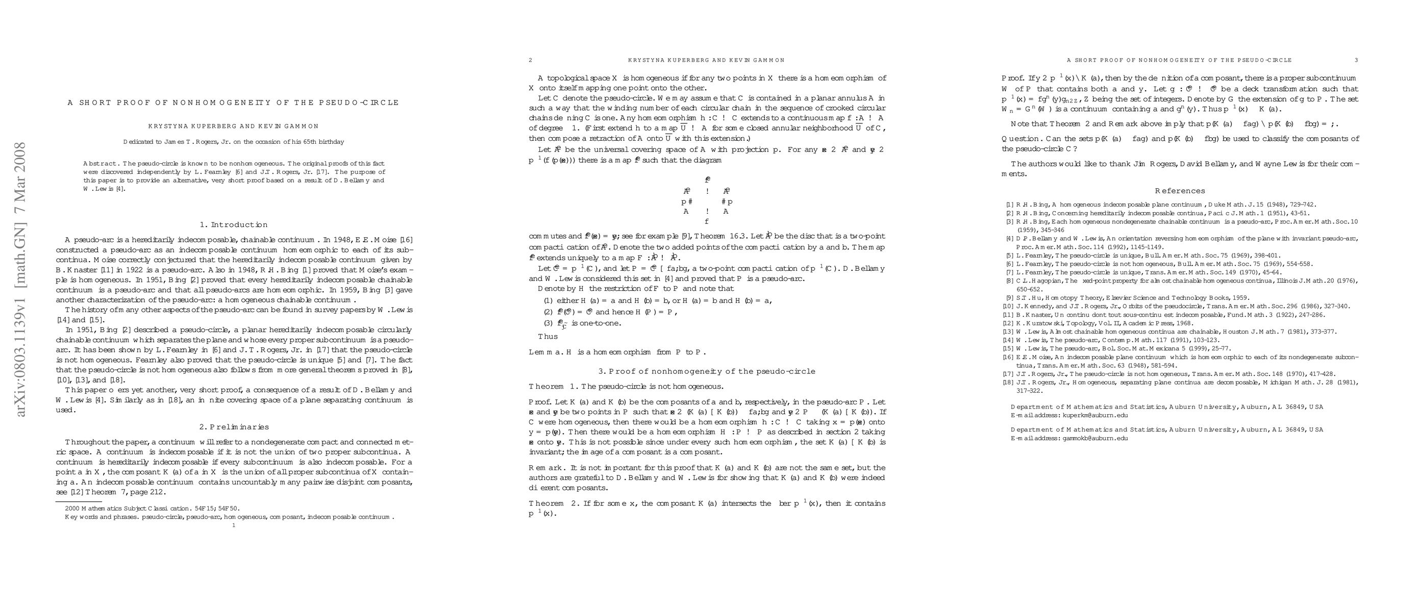 The pseudo-circle is known to be nonhomogeneous. The original proofs of this fact were discovered independently by L. Fearnley and J.T. Rogers, Jr. The purpose of this paper is to provide an alternative, very short proof based on a result of D. Bellamy and W. Lewis.