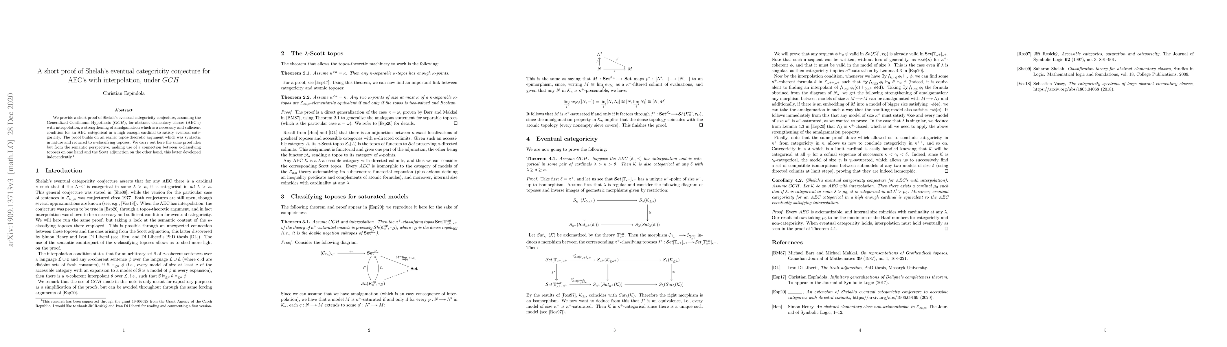 Summary: This paper offers a concise proof of Shelah's eventual categoricity conjecture for abstract elementary classes (AEC's) with interpolation, under the Generalized Continuum Hypothesis. The proof shifts from a syntactic topos-theoretic approach to a semantic perspective, leveraging connections between $\kappa$-classifying toposes and Scott adjunction.