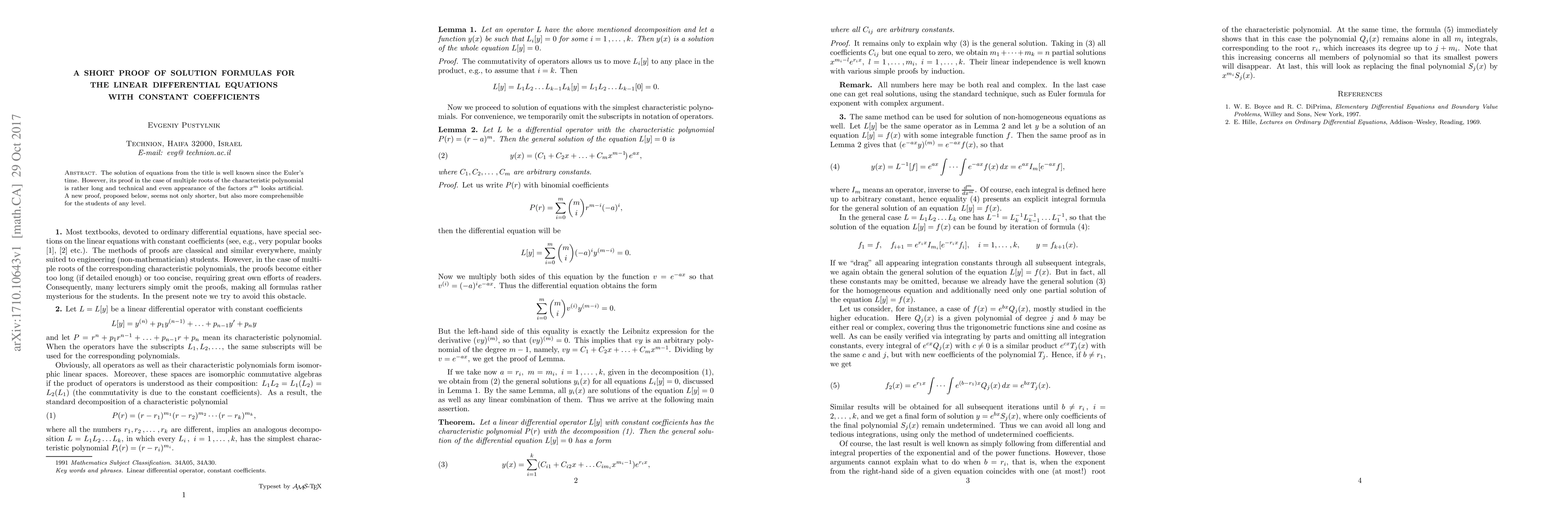 The solution of equations from the title is well known since the Euler's time. However, its proof in the case of multiple roots of the characteristic polynomial is rather long and technical and even appearance of the factors $x^m$ looks artificial. A new proof, proposed below, seems not only shorter, but also more comprehensible for the students of any level.