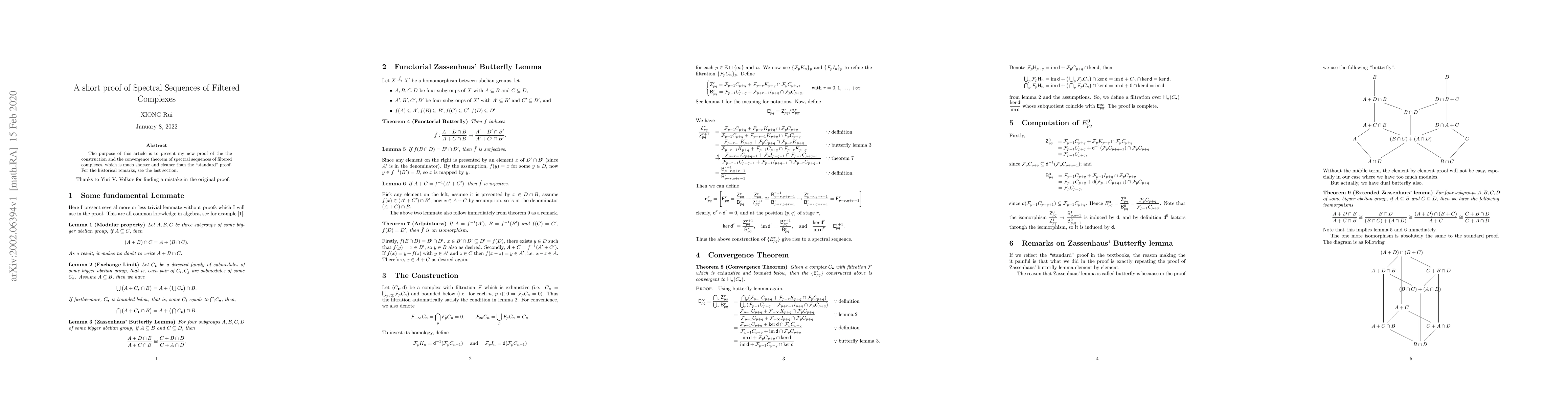 This paper presents a concise and streamlined proof for the construction and convergence of spectral sequences in filtered complexes, offering a more straightforward approach compared to traditional methods. The new proof aims to simplify the understanding of these complex mathematical structures.