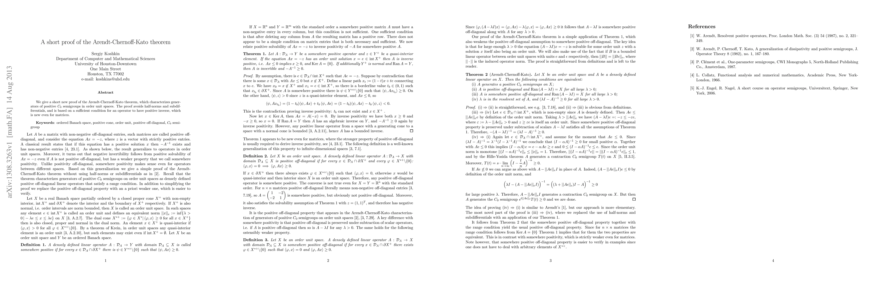 We give a short new proof of the Arendt-Chernoff-Kato theorem, which characterizes generators of positive C0 semigroups in order unit spaces. The proof avoids half-norms and subdifferentials, and is based on a sufficient condition for an operator to have positive inverse, which is new even for matrices.