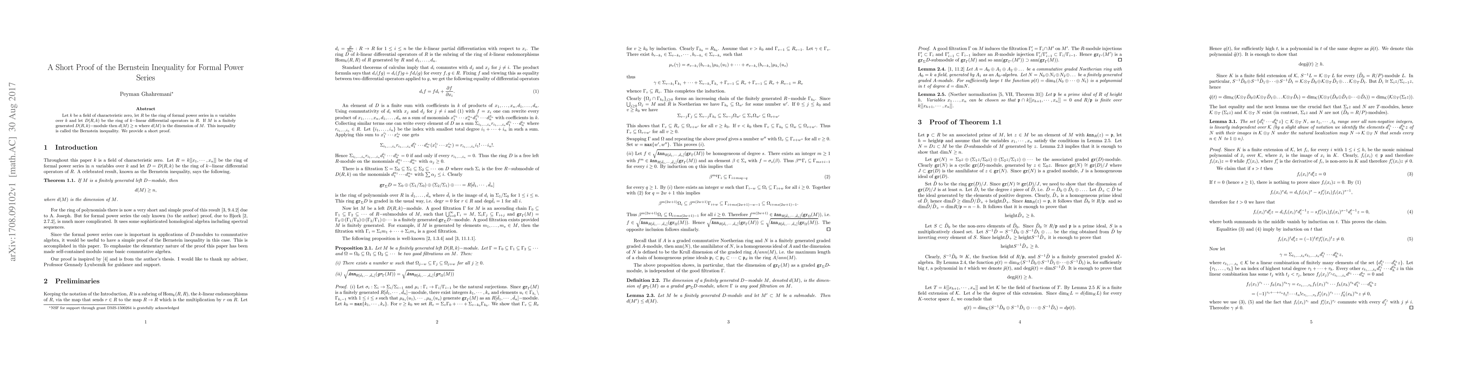 This paper presents a concise proof of the Bernstein inequality for formal power series, demonstrating that the dimension of any finitely generated module over the ring of differential operators in formal power series is at least equal to the number of variables.