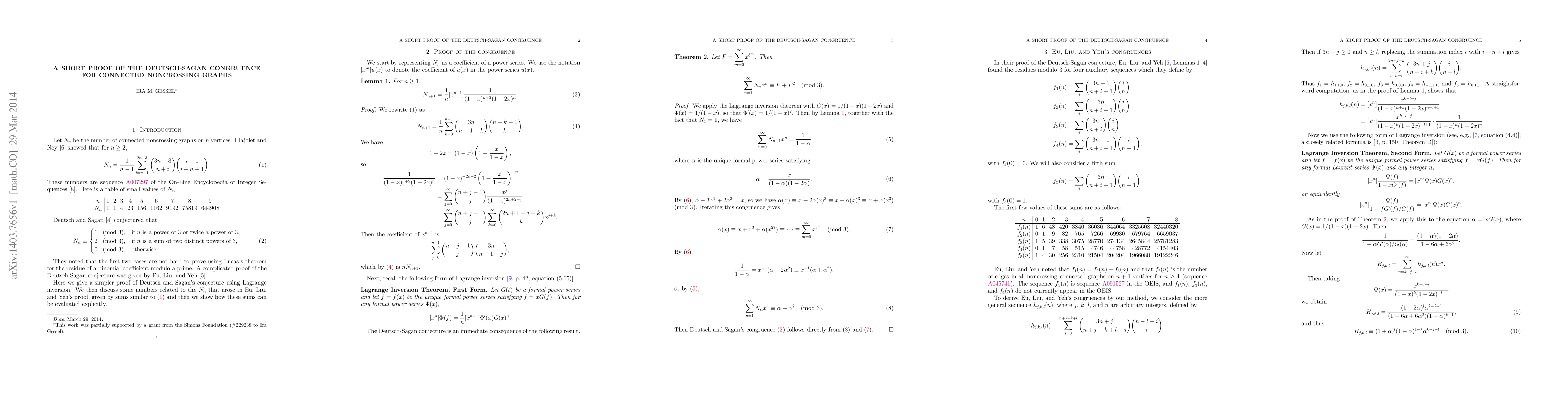 Summary: This paper presents a concise proof using Lagrange inversion for the Deutsch-Sagan congruence modulo 3 concerning connected noncrossing graphs on n vertices, contrasting with a more complex prior proof by Eu, Liu, and Yeh.