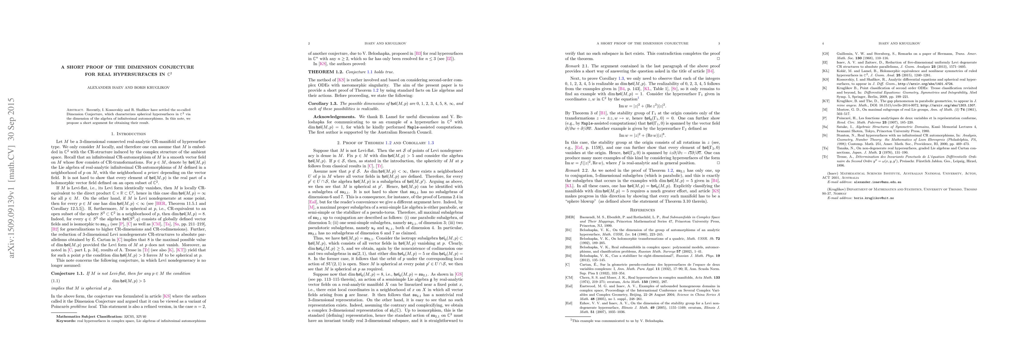 Recently, I. Kossovskiy and R. Shafikov have settled the so-called Dimension Conjecture, which characterizes spherical hypersurfaces in ${\mathbb C}^2$ via the dimension of the algebra of infinitesimal automorphisms. In this note, we propose a short argument for obtaining their result.