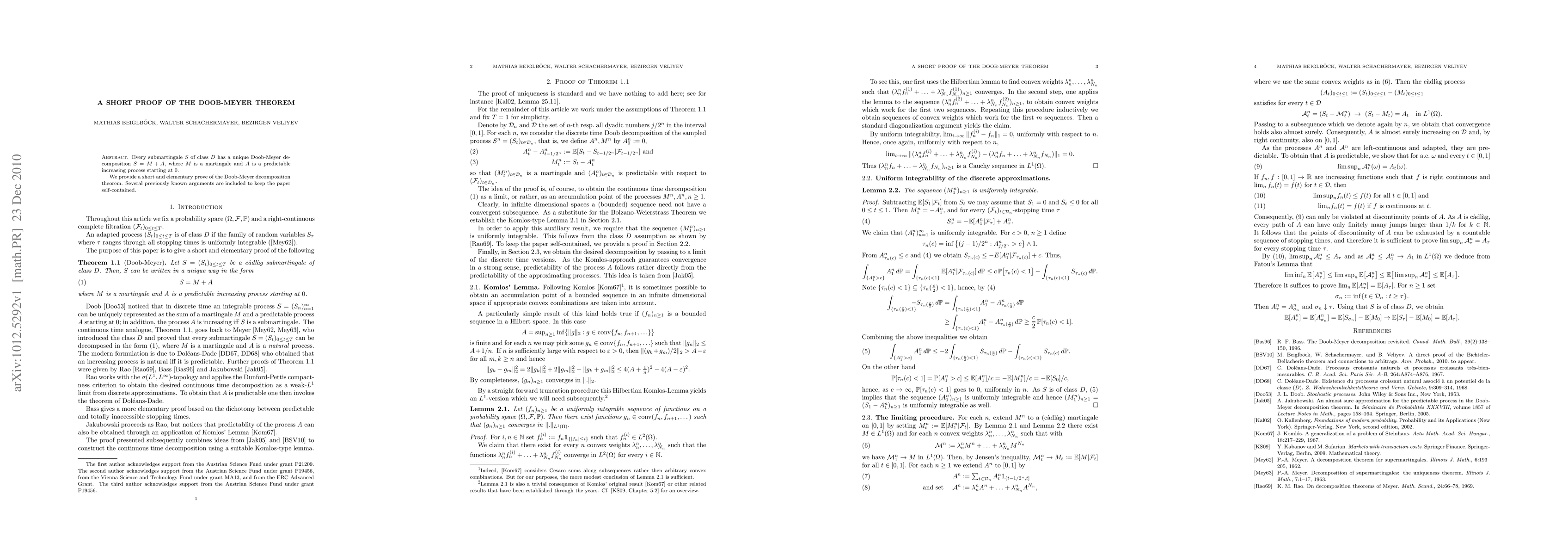 The paper presents a short and elementary proof of the Doob-Meyer decomposition theorem, utilizing ideas from previous works, including Rao, Bass, and Jakubowski, and establishing convergence via a Komlos-type lemma.