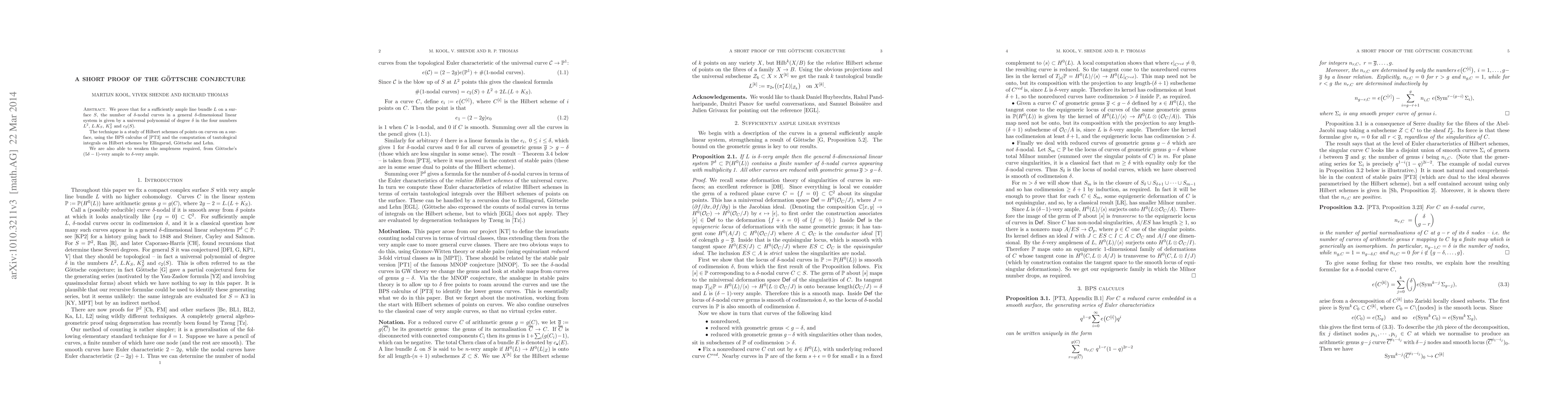 This paper proves the Göttsche conjecture by showing that the number of δ-nodal curves in a general δ-dimensional linear system on a surface is determined by a universal polynomial. The proof utilizes Hilbert schemes, BPS calculus, and tautological integrals, and relaxes the ampleness condition for the line bundle.