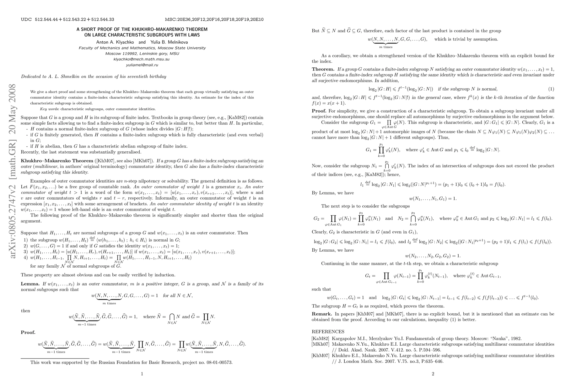 We give a short proof and some strengthening of the Khukhro--Makarenko theorem that each group virtually satisfying an outer commutator identity contains a finite-index characteristic subgroup satisfying this identity. An estimate for the index of this characteristic subgroup is obtained.