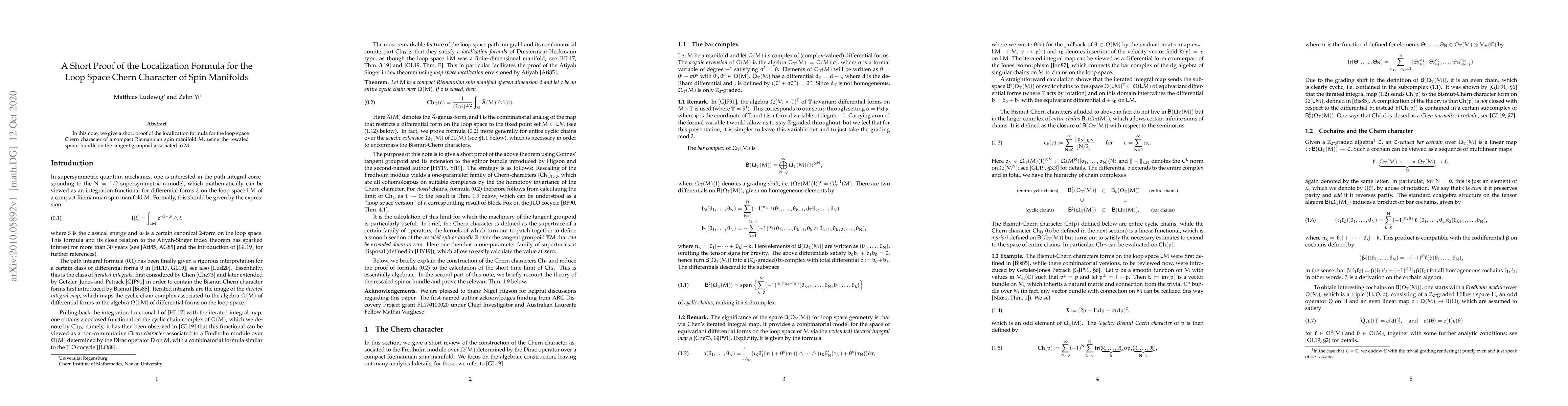In this note, we give a short proof of the localization formula for the loop space Chern character of a compact Riemannian spin manifold M, using the rescaled spinor bundle on the tangent groupoid associated to M.
