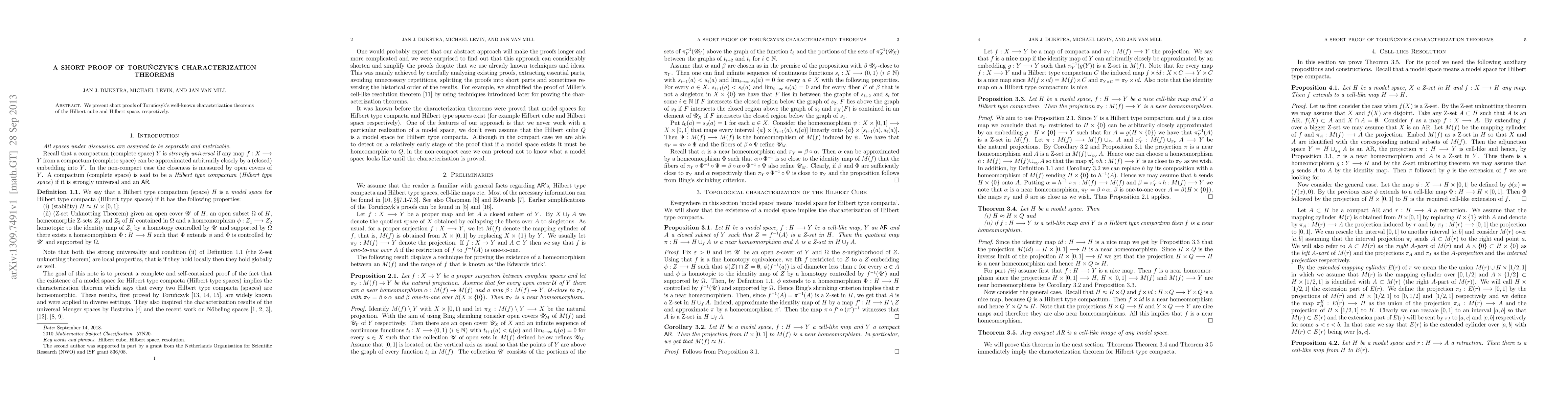 We present short proofs of Toru\'nczyk's well-known characterization theorems of the Hilbert cube and Hilbert space, respectively.