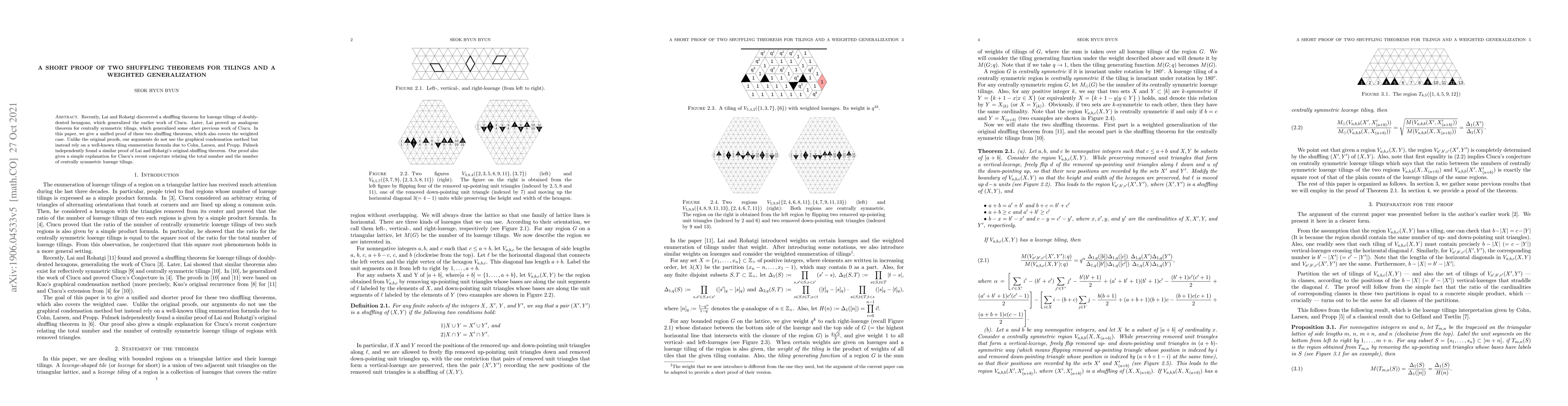 Recently, Lai and Rohatgi discovered a shuffling theorem for lozenge tilings of doubly-dented hexagons, which generalized the earlier work of Ciucu. Later, Lai proved an analogous theorem for centrally symmetric tilings, which generalized some other previous work of Ciucu. In this paper, we give a unified proof of these two shuffling theorems, which also covers the weighted case. Unlike the original proofs, our arguments do not use the graphical condensation method but instead rely on a well-known tiling enumeration formula due to Cohn, Larsen, and Propp. Fulmek independently found a similar proof of Lai and Rohatgi's original shuffling theorem. Our proof also gives a combinatorial explanation for Ciucu's recent conjecture relating the total number and the number of centrally symmetric lozenge tilings.