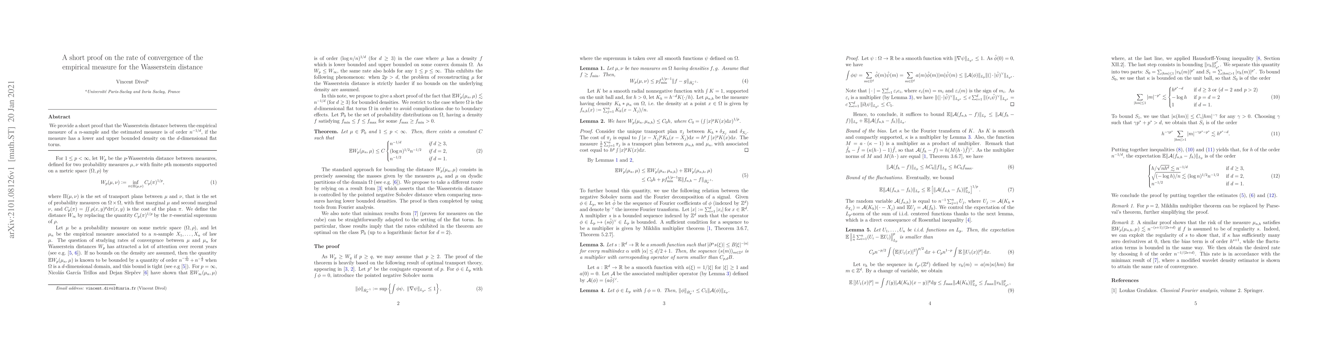 Summary: This paper offers a concise proof demonstrating that the Wasserstein distance between an empirical measure from an n-sample and the true measure converges at a rate of n^(-1/d), under the condition that the measure's density is bounded on a d-dimensional flat torus.