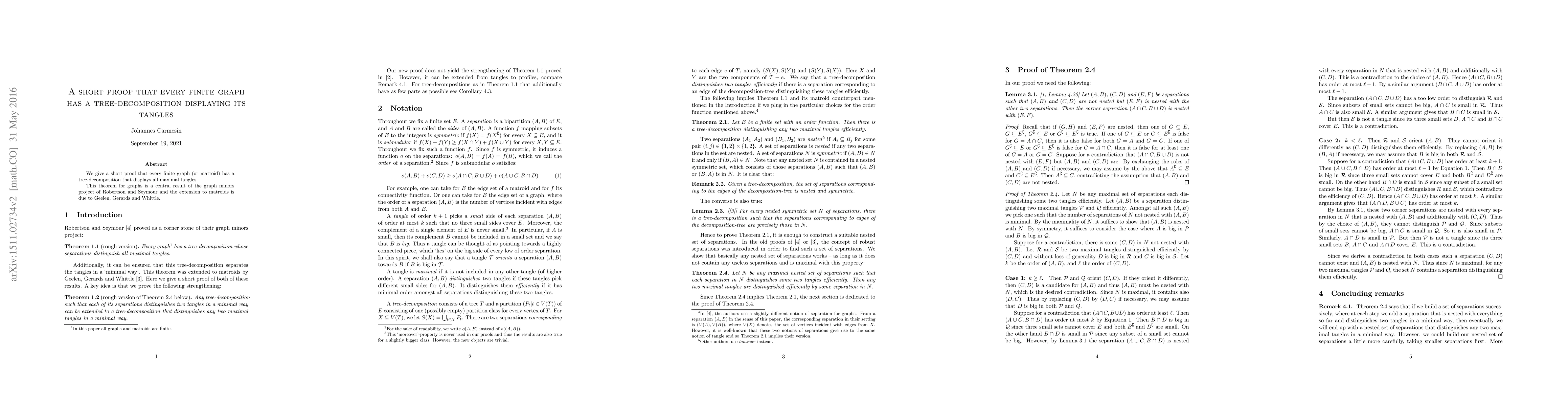 Summary: This paper presents a concise proof that every finite graph possesses a tree-decomposition showcasing all maximal tangles, a key result from the graph minors project by Robertson and Seymour, with an extension to matroids by Geelen, Gerards, and Whittle.