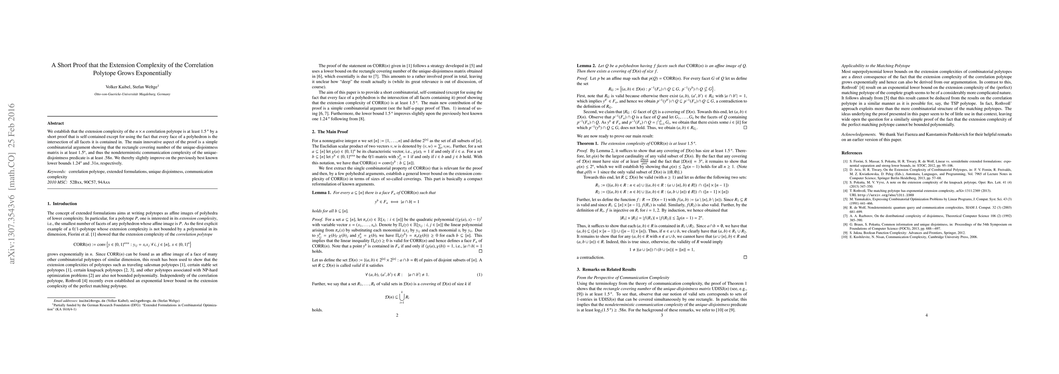 We establish that the extension complexity of the nXn correlation polytope is at least 1.5^n by a short proof that is self-contained except for using the fact that every face of a polyhedron is the intersection of all facets it is contained in. The main innovative aspect of the proof is a simple combinatorial argument showing that the rectangle covering number of the unique-disjointness matrix is at least 1.5^n, and thus the nondeterministic communication complexity of the unique-disjointness predicate is at least .58n. We thereby slightly improve on the previously best known lower bounds 1.24^n and .31n, respectively.