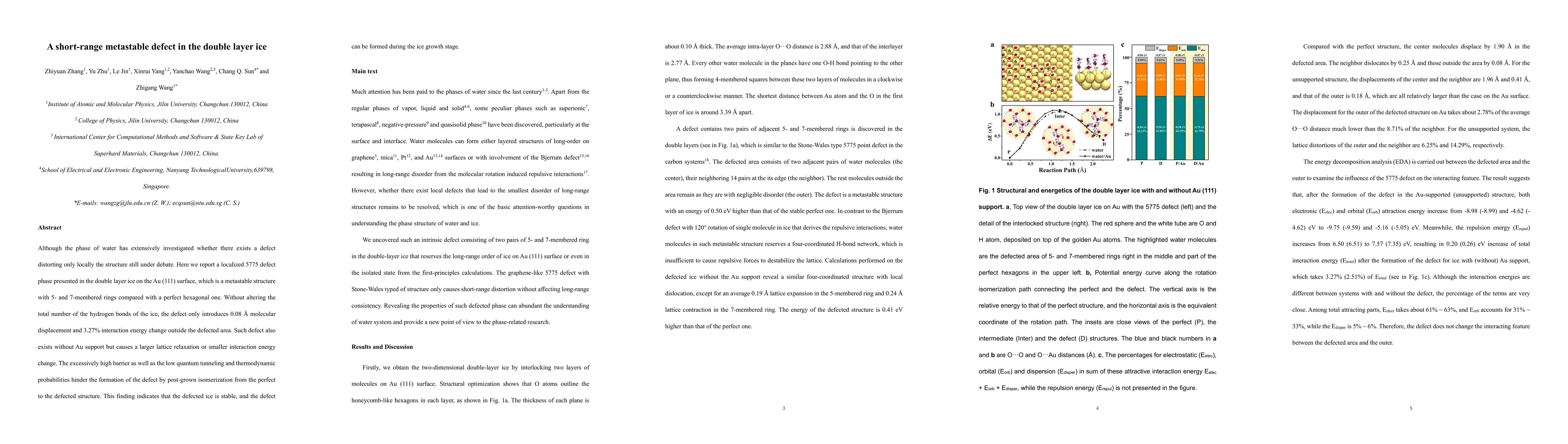 Although the phase of water has extensively investigated whether there exists a defect distorting only locally the structure still under debate. Here we report a localized 5775 defect phase presented in the double layer ice on the Au (111) surface, which is a metastable structure with 5- and 7-membered rings compared with a perfect hexagonal one. Without altering the total number of the hydrogen bonds of the ice, the defect only introduces 0.08 {\AA} molecular displacement and 3.27% interaction energy change outside the defected area. Such defect also exists without Au support but causes a larger lattice relaxation or smaller interaction energy change. The excessively high barrier as well as the low quantum tunneling and thermodynamic probabilities hinder the formation of the defect by post-grown isomerization from the perfect to the defected structure. This finding indicates that the defected ice is stable, and the defect can be formed during the ice growth stage.