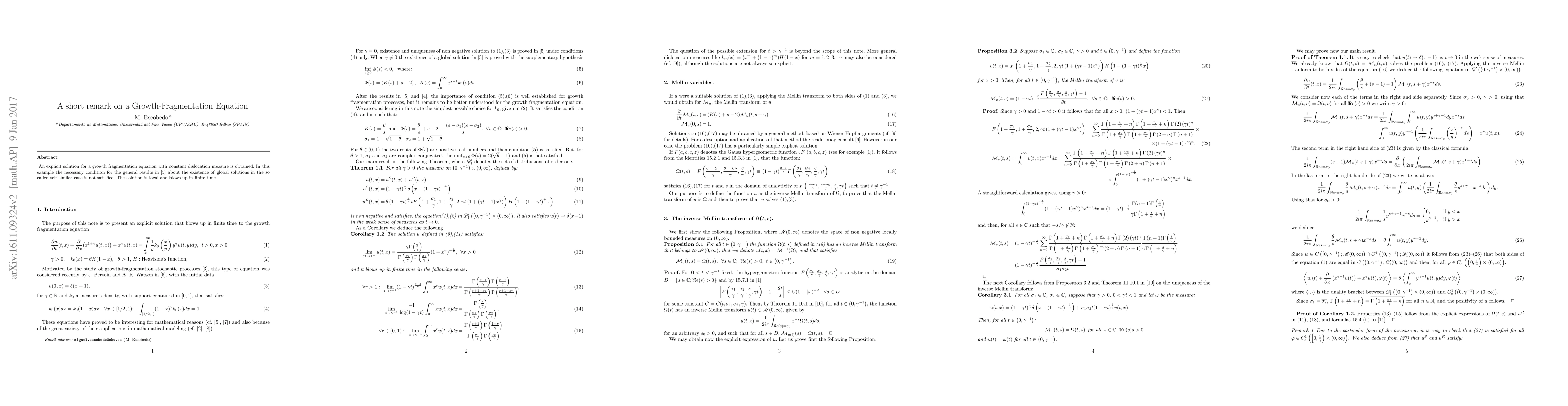 This paper presents an explicit local solution for a growth fragmentation equation with a constant dislocation measure, demonstrating that the necessary condition for global solutions in the self-similar case is not met, leading to a solution that blows up in finite time.