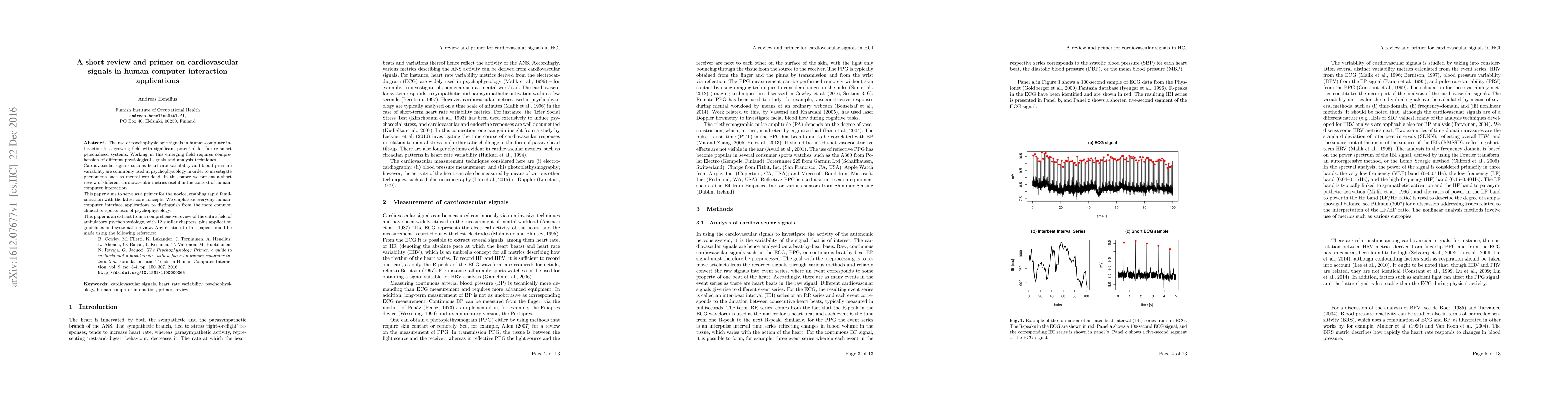 This paper reviews cardiovascular signals like heart rate variability and blood pressure variability for human-computer interaction applications, aiming to familiarize novices with core concepts and distinguish them from clinical or sports uses. It serves as a primer extracted from a comprehensive review of ambulatory psychophysiology.