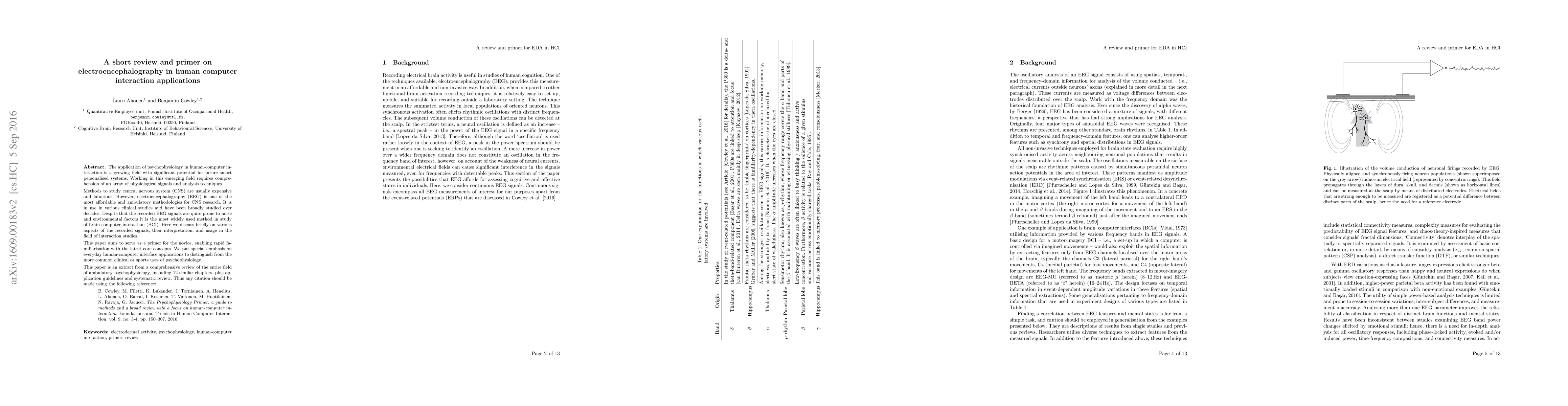 The application of psychophysiology in human-computer interaction is a growing field with significant potential for future smart personalised systems. Working in this emerging field requires comprehension of an array of physiological signals and analysis techniques. Methods to study central nervous system (CNS) are usually expensive and laborious. However, electroencephalography (EEG) is one of the most affordable and ambulatory methodologies for CNS research. It is in use in various clinical studies and have been broadly studied over decades. Despite that the recorded EEG signals are quite prone to noise and environmental factors it is the most widely used method in study of brain-computer interaction (BCI). Here we discuss briefly on various aspects of the recorded signals, their interpretation, and usage in the field of interaction studies. This paper aims to serve as a primer for the novice, enabling rapid familiarisation with the latest core concepts. We put special emphasis on everyday human-computer interface applications to distinguish from the more common clinical or sports uses of psychophysiology. This paper is an extract from a comprehensive review of the entire field of ambulatory psychophysiology, including 12 similar chapters, plus application guidelines and systematic review. Thus any citation should be made using the following reference: B. Cowley, M. Filetti, K. Lukander, J. Torniainen, A. Henelius, L. Ahonen, O. Barral, I. Kosunen, T. Valtonen, M. Huotilainen, N. Ravaja, G. Jacucci. The Psychophysiology Primer: a guide to methods and a broad review with a focus on human-computer interaction. Foundations and Trends in Human-Computer Interaction, vol. 9, no. 3-4, pp. 150--307, 2016.