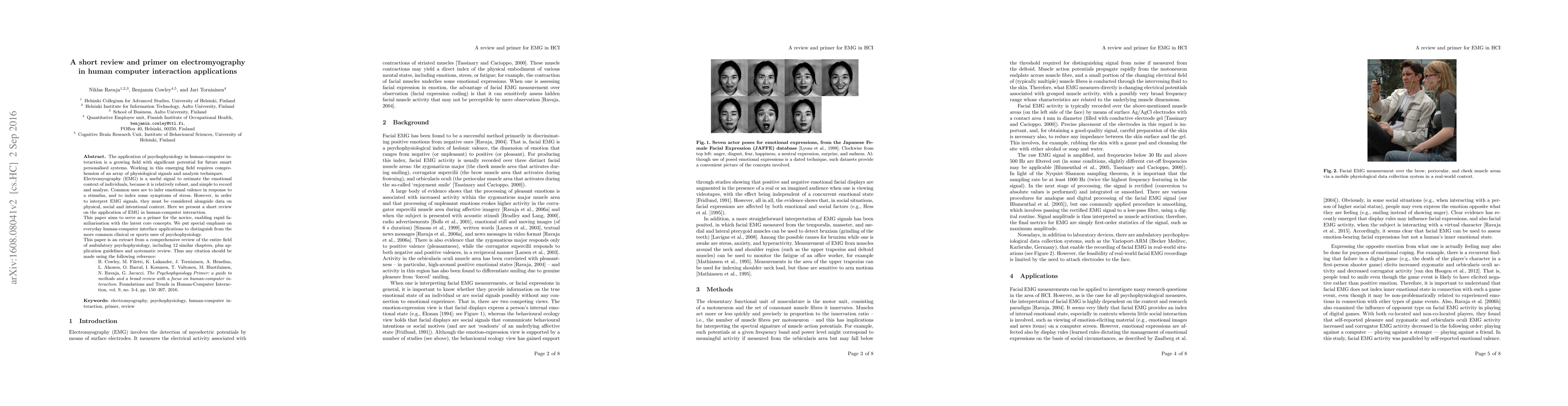 The application of psychophysiology in human-computer interaction is a growing field with significant potential for future smart personalised systems. Working in this emerging field requires comprehension of an array of physiological signals and analysis techniques. Electromyography (EMG) is a useful signal to estimate the emotional context of individuals, because it is relatively robust, and simple to record and analyze. Common uses are to infer emotional valence in response to a stimulus, and to index some symptoms of stress. However, in order to interpret EMG signals, they must be considered alongside data on physical, social and intentional context. Here we present a short review on the application of EMG in human-computer interaction. This paper aims to serve as a primer for the novice, enabling rapid familiarisation with the latest core concepts. We put special emphasis on everyday human-computer interface applications to distinguish from the more common clinical or sports uses of psychophysiology. This paper is an extract from a comprehensive review of the entire field of ambulatory psychophysiology, including 12 similar chapters, plus application guidelines and systematic review. Thus any citation should be made using the following reference: B. Cowley, M. Filetti, K. Lukander, J. Torniainen, A. Henelius, L. Ahonen, O. Barral, I. Kosunen, T. Valtonen, M. Huotilainen, N. Ravaja, G. Jacucci. The Psychophysiology Primer: a guide to methods and a broad review with a focus on human-computer interaction. Foundations and Trends in Human-Computer Interaction, vol. 9, no. 3-4, pp. 150--307, 2016.