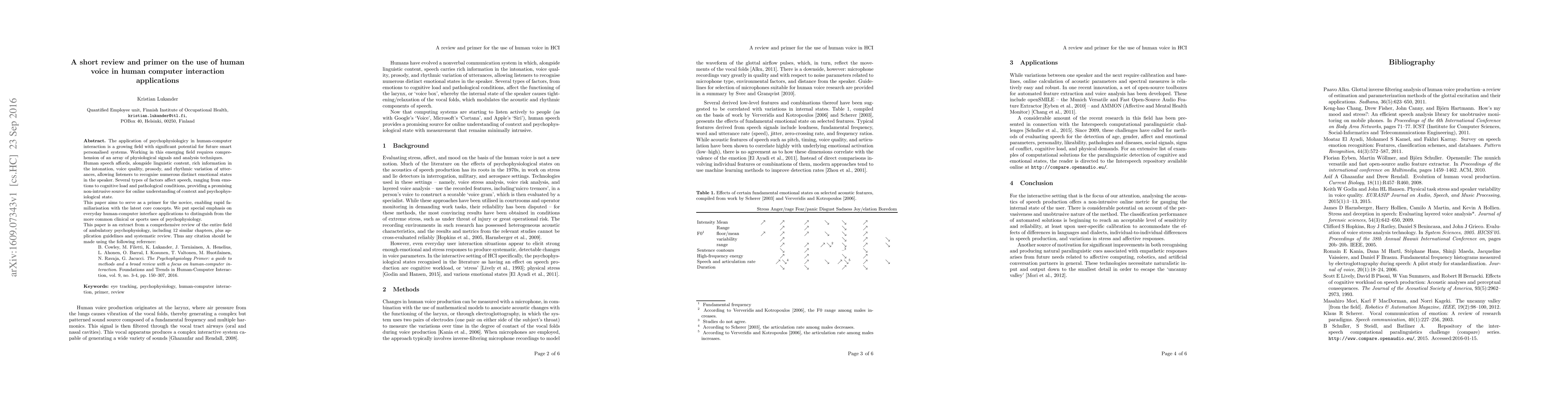 This paper serves as a primer for newcomers to the field of human-computer interaction, focusing on the use of human voice to understand emotional states and cognitive load. It emphasizes practical applications in everyday interfaces, distinguishing them from clinical uses, and is part of a broader review on ambulatory psychophysiology.