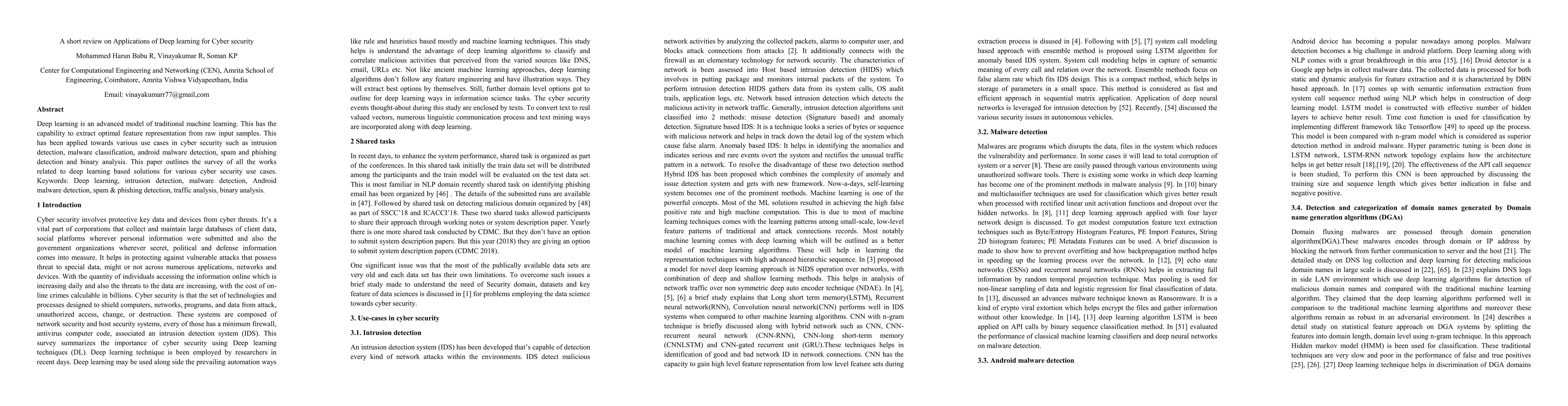 This paper reviews deep learning applications in cybersecurity, highlighting its use in intrusion detection, malware classification, Android malware detection, spam and phishing detection, and binary analysis. It surveys the current state of deep learning-based solutions for these security challenges.