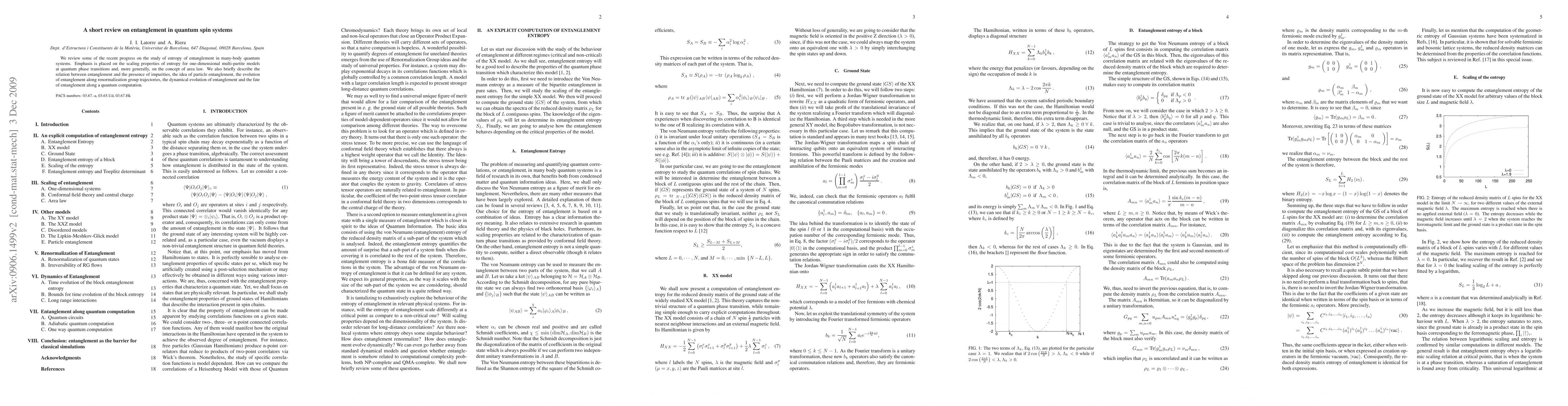 This paper reviews recent progress on studying entropy in quantum systems, focusing on scaling properties of entanglement at quantum phase transitions and the area law concept. It also explores relationships between entanglement and impurities, particle entanglement, and its evolution in various scenarios.