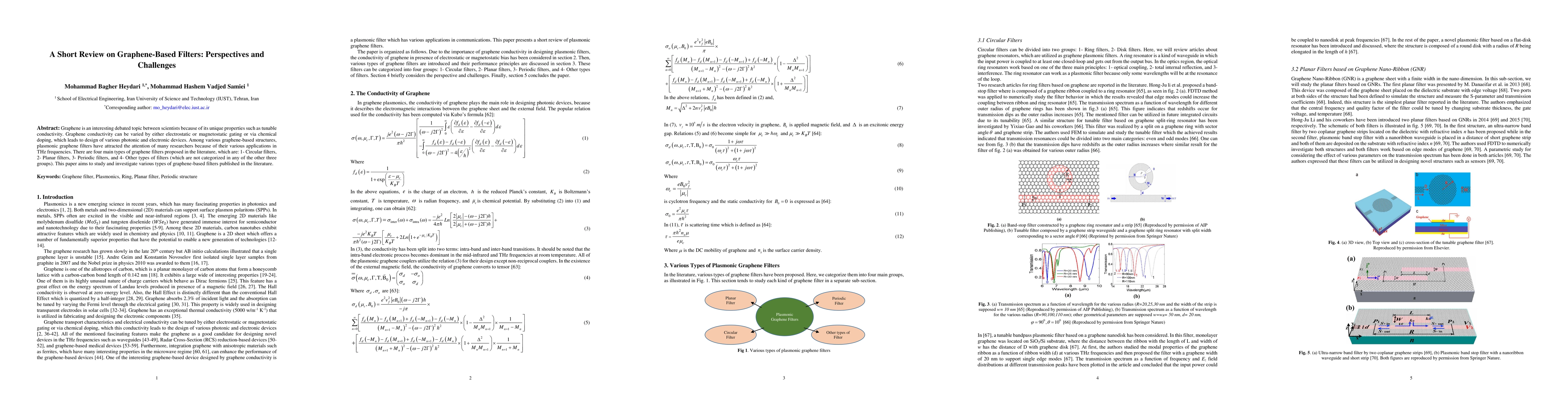 Graphene is an interesting debated topic between scientists because of its unique properties such as tunable conductivity. Graphene conductivity can be varied by either electrostatic or magnetostatic gating or via chemical doping, which leads to design of various photonic and electronic devices. Among various graphene-based structures, plasmonic graphene filters have attracted the attention of many researchers because of their various applications in THz frequencies. There are four main types of graphene filters proposed in the literature, which are: 1- Circular filters, 2- Planar filters, 3- Periodic filters, and 4- Other types of filters (which are not categorized in any of the other three groups). This paper aims to study and investigate various types of graphene-based filters published in the literature.