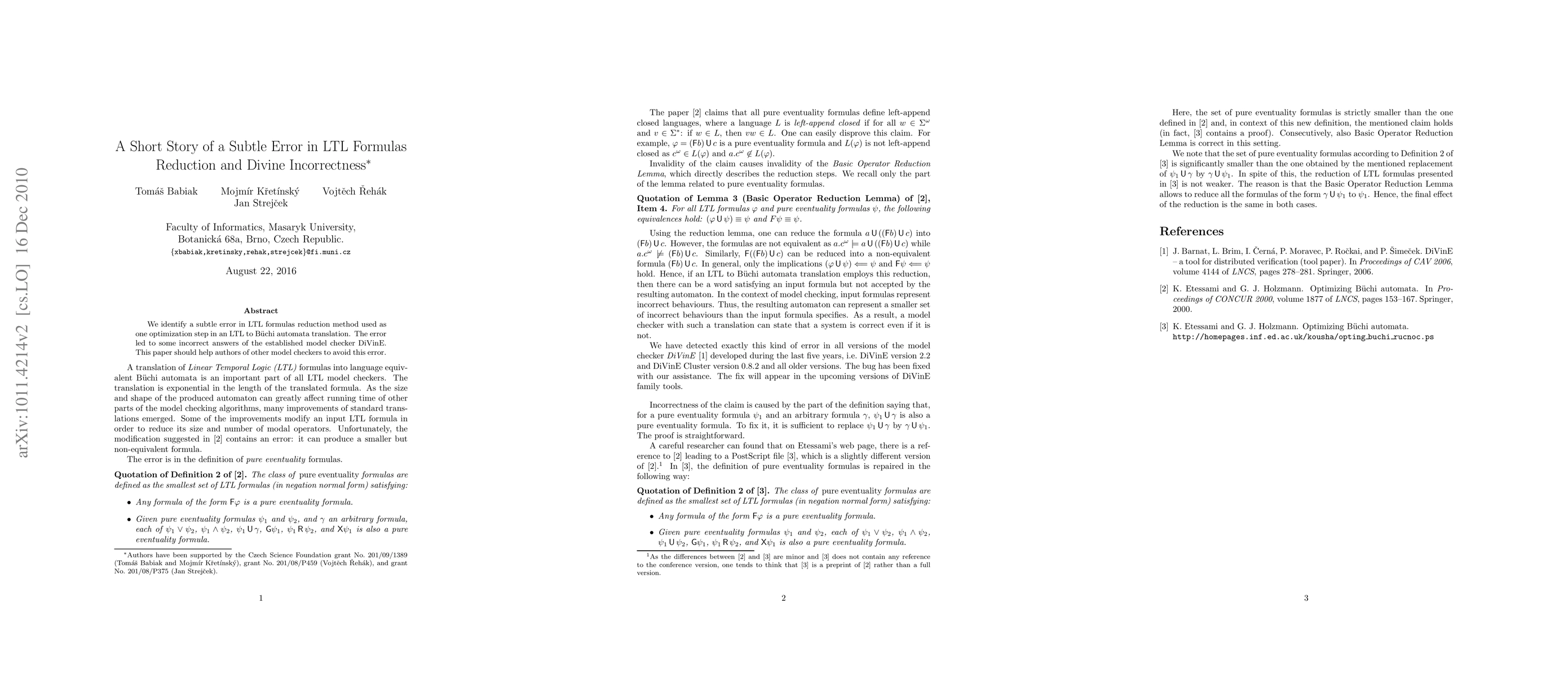 This paper identifies a subtle error in the LTL formulas reduction method used in the LTL to B\"uchi automata translation, which caused incorrect results in the DiVinE model checker. It aims to inform and assist other model checker developers in avoiding similar mistakes.