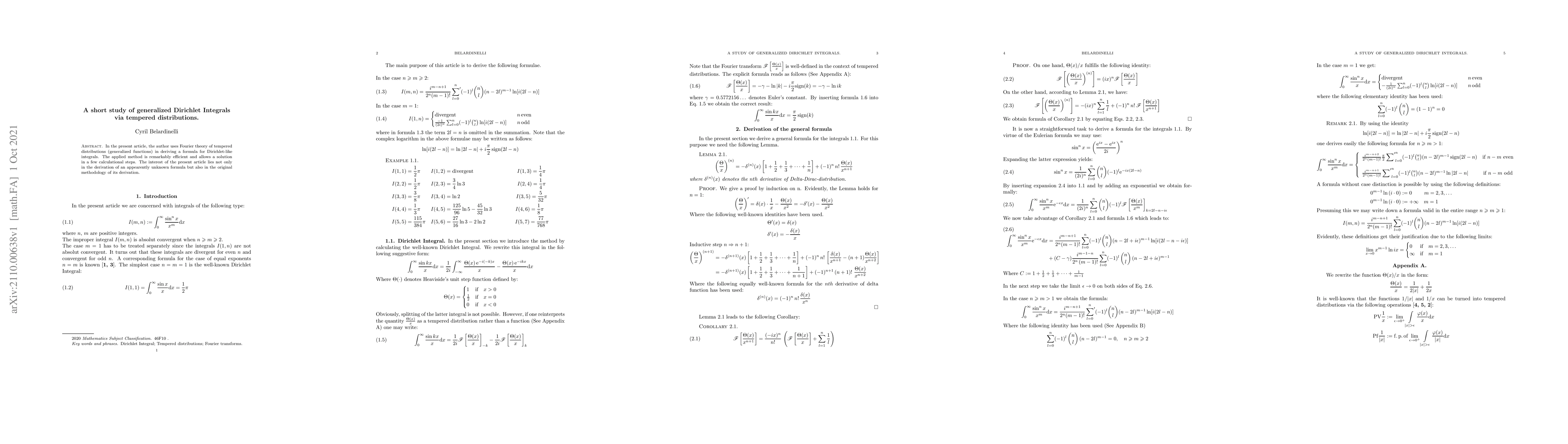 In the present article, the author uses Fourier theory of tempered distributions (generalized functions) in deriving a formula for Dirichlet-like integrals. The applied method is remarkably efficient and allows a solution in a few calculational steps. The interest of the present article lies not only in the derivation of an appearently unknown formula but also in the original methodology of its derivation.
