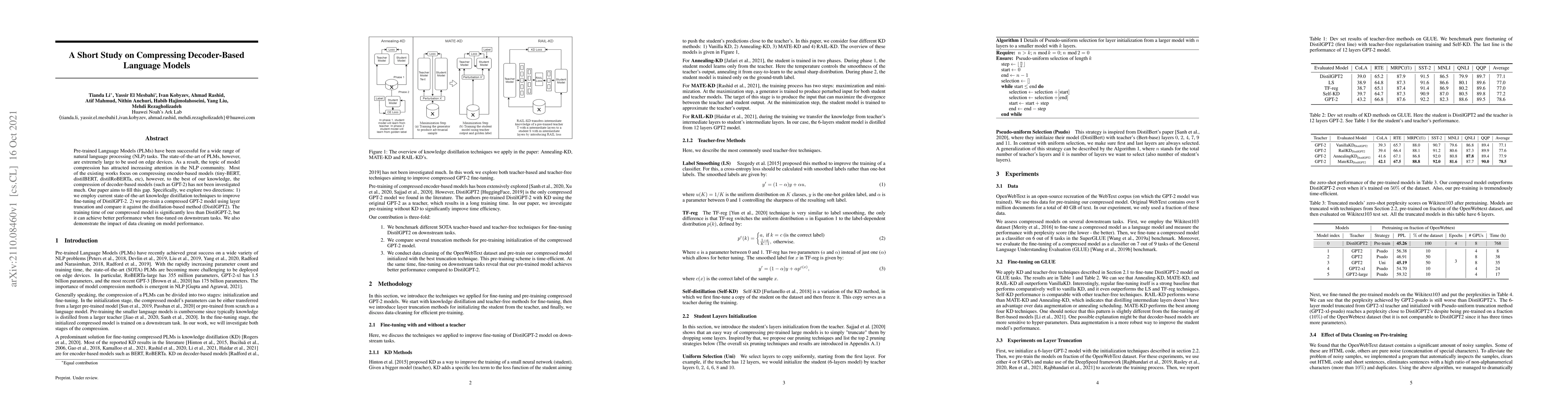 This paper investigates the compression of decoder-based language models, specifically GPT-2, contrasting it with existing encoder-based compression methods. The study explores knowledge distillation and pre-training with layer truncation, finding that the latter achieves better performance post fine-tuning despite shorter training time.