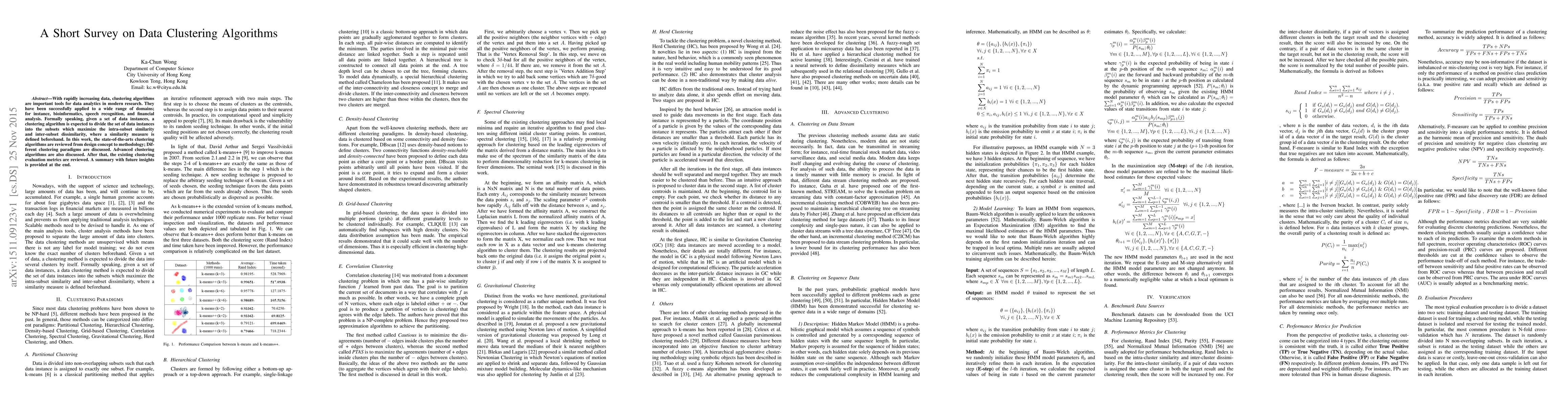 With rapidly increasing data, clustering algorithms are important tools for data analytics in modern research. They have been successfully applied to a wide range of domains; for instance, bioinformatics, speech recognition, and financial analysis. Formally speaking, given a set of data instances, a clustering algorithm is expected to divide the set of data instances into the subsets which maximize the intra-subset similarity and inter-subset dissimilarity, where a similarity measure is defined beforehand. In this work, the state-of-the-arts clustering algorithms are reviewed from design concept to methodology; Different clustering paradigms are discussed. Advanced clustering algorithms are also discussed. After that, the existing clustering evaluation metrics are reviewed. A summary with future insights is provided at the end.